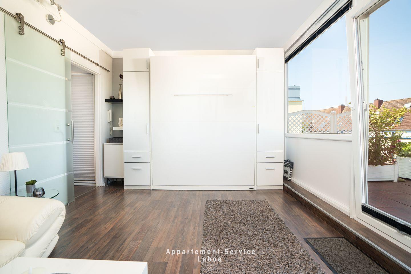 FeWo Sünnstrohl: Einzimmerwohnung mit ca. 30?m² für 2 Personen im Zentrum von Laboe, wenige Meter vom Strand entfernt. Wohn-/Schlafbereich mit Schrankbett (160x200), Ledercouch, TV, HiFi-Anlage und Infrarotheizung. Separate Küche mit Spülmaschine, Induktionsherd, Kaffeemaschine. Bad mit Dusche/WC. Highlight: ca.?45?m² möblierte Dachterrasse, Strandkorb und Blick aufs Ehrenmal.