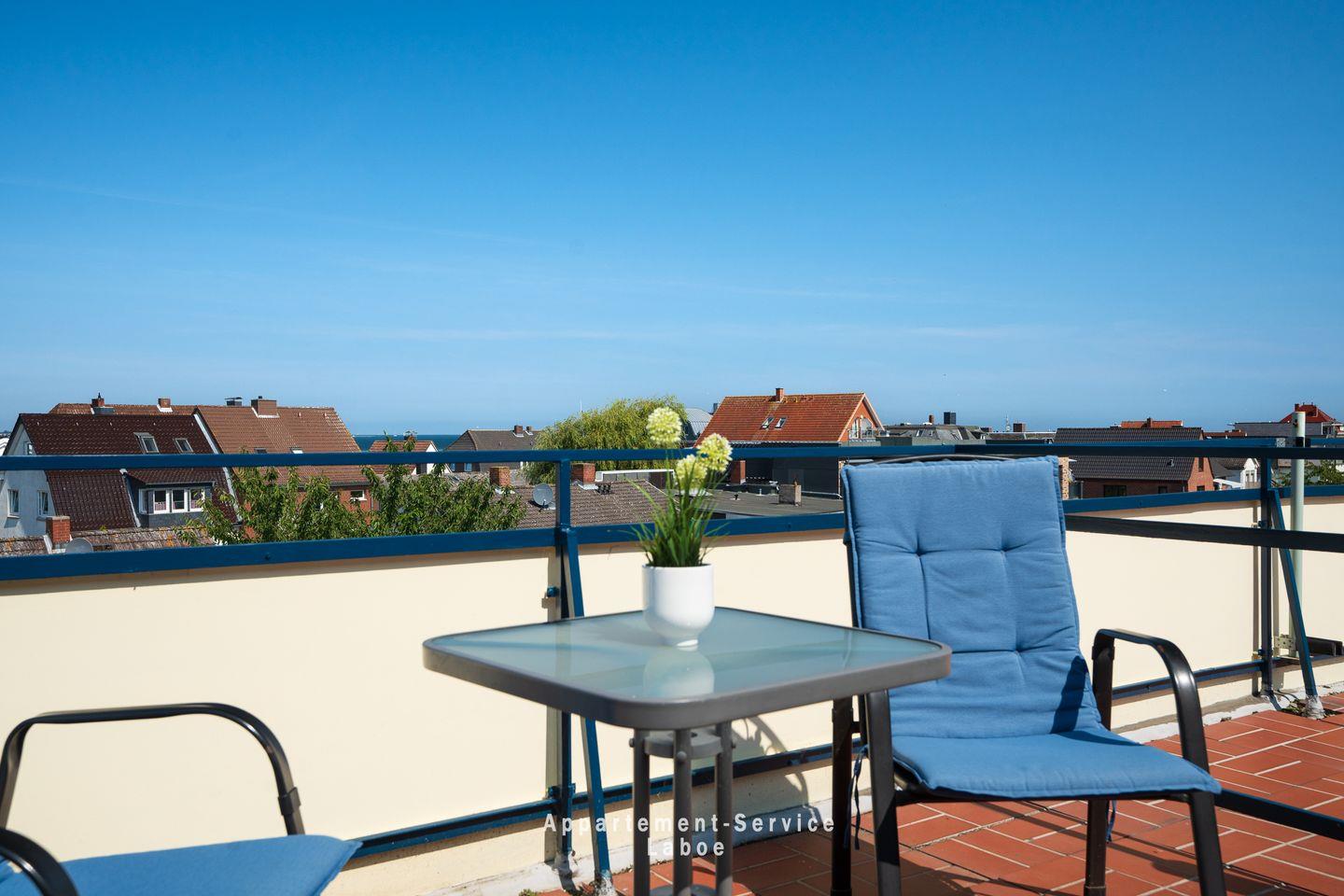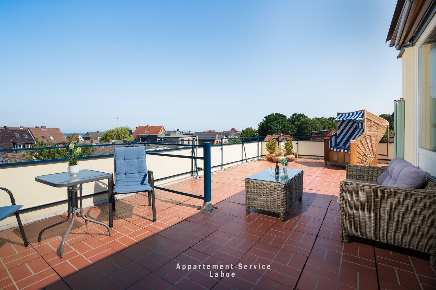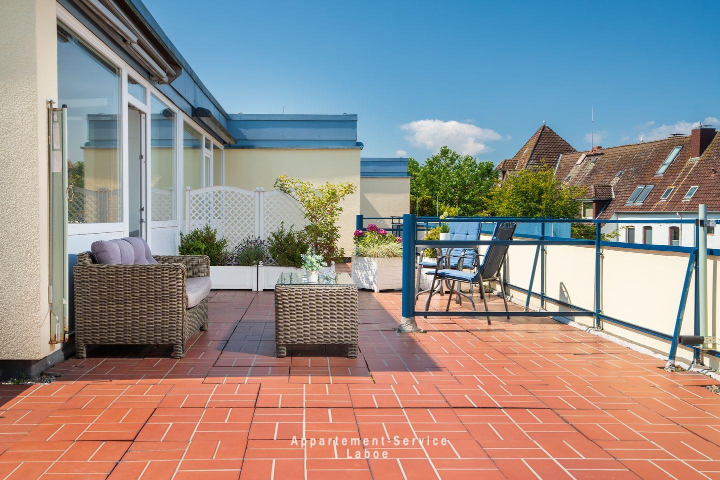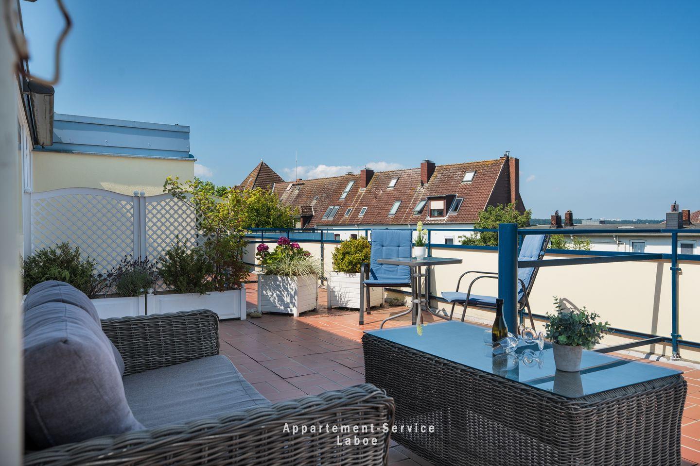 Auf der großflächigen Dachterrasse mit ca. 45 qm erlebst du unvergessliche Sonnenuntergänge, gern auch in unserem neuen Strandkorb. Lass dich verzaubern von dem Blick auf das Laboer Ehrenmal, das Wahrzeichen unseres schönen Ostseebads und träum der rosa Sonne entgegen. Eine Sonnenliege, ein Relaxstuhl, Esstisch und Stühle stehen dir für laue Sommerabende auf der Dachterrasse zur Verfügung.