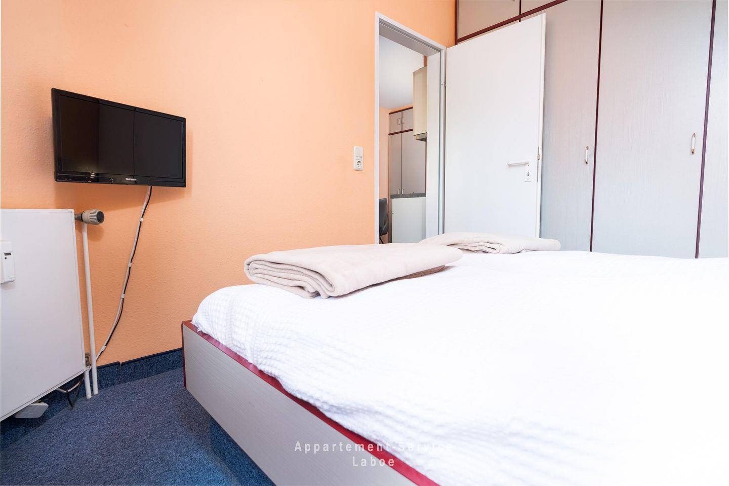 Die Wohnung ist praktisch und zweckmäßig eingerichtet. Das Wohn-Schlafzimmer mit einer bequemen Doppelschlafcouch bietet dir tagsüber einen gemütlichen Platz zum Entspannen, und abends wird es im Handumdrehen zum Schlafbereich. Ein TV sorgt für Unterhaltung, und dank kostenfreiem WLAN bleibst du auch im Urlaub immer vernetzt.