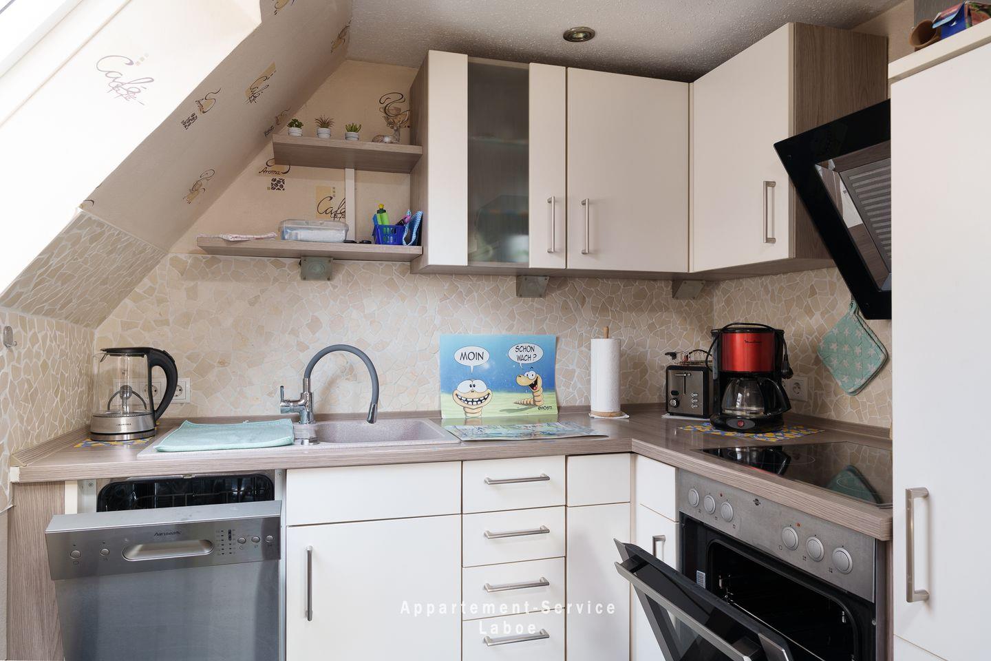 Der Mittelpunkt der Wohnung ist das gemütliche Wohnzimmer mit einer großen Sitzgruppe, die zu gemeinsamen Stunden einlädt – ob beim Spielen, Lesen oder einfach beim Abschalten nach einem langen Strandtag. In einer offenen Nische ist die voll ausgestattete Küche integriert. Sie verfügt über einen Geschirrspüler, einen Backofen, ein Ceranfeld sowie sämtliche Küchenutensilien. Der angrenzende Essbereich befindet sich ebenfalls im Wohnzimmer und bietet einen geselligen Platz für gemeinsame Mahlzeiten.
