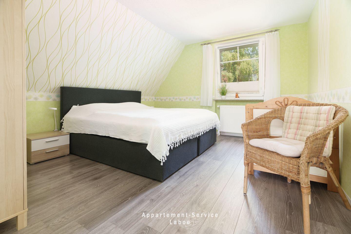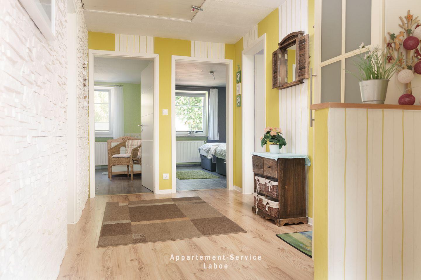 FeWo Kuhnert: 4-Zimmer-Wohnung, ca. 80 m², im 1. Obergeschoss, für bis zu 5 Erwachsene und 1 Kleinkind. Drei Schlafzimmer: eins mit Doppelbett und Kinderbett, eins mit zwei Einzelbetten, eins mit einem Einzelbett. Wohnzimmer mit Sitzgruppe, Essbereich, Sat-TV, Stereoanlage, DVD-Player und WLAN. Offene Küchenzeile mit Ceranfeld, Backofen, Geschirrspüler und Küchenutensilien. Badezimmer mit Dusche, Badewanne und WC. Kleiner Balkon. Pkw-Stellplatz direkt an der Unterkunft. Zentrale Lage in Laboe, ca. 50?m zur Strandpromenade, fußläufig zu Hafen, Einkaufsmöglichkeiten, Gastronomie und Bäcker.