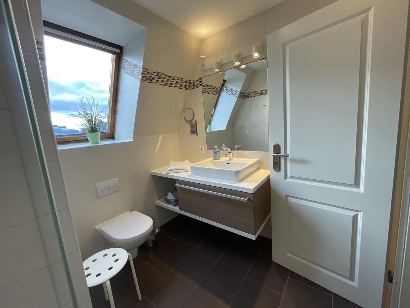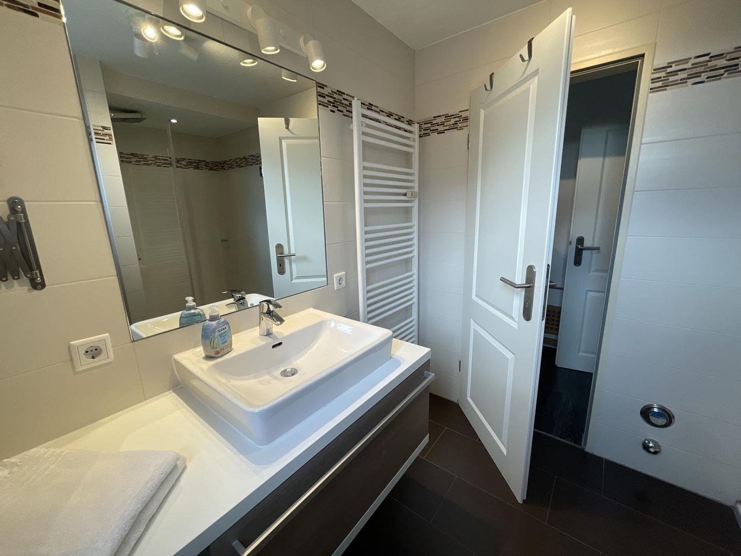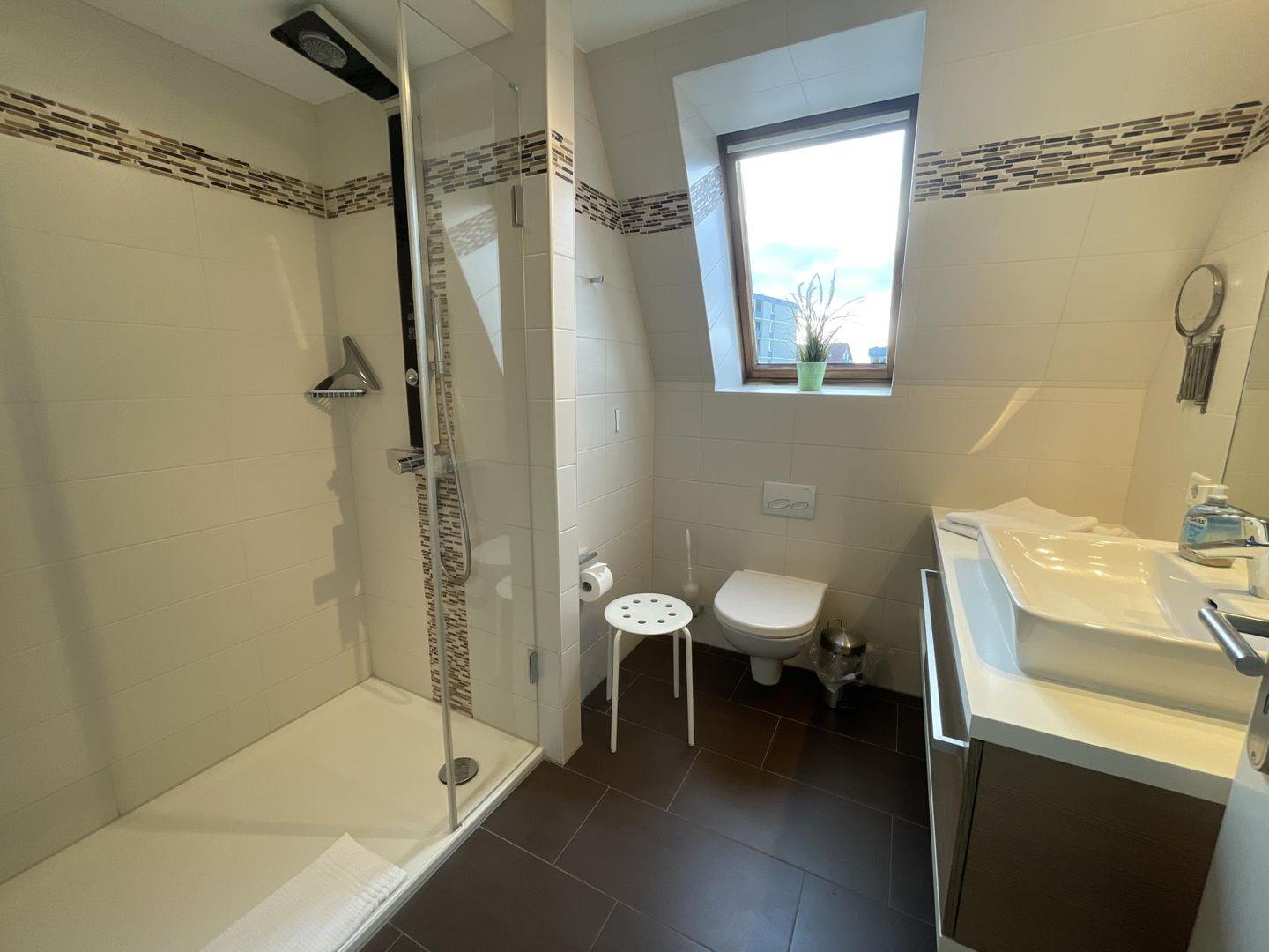 Das Badezimmer ist modern und funktional – mit Dusche, WC, Föhn und Kosmetikspiegel. WLAN ist selbstverständlich vorhanden. Waschmaschine und Trockner stehen im Haus zur gemeinschaftlichen Nutzung bereit.