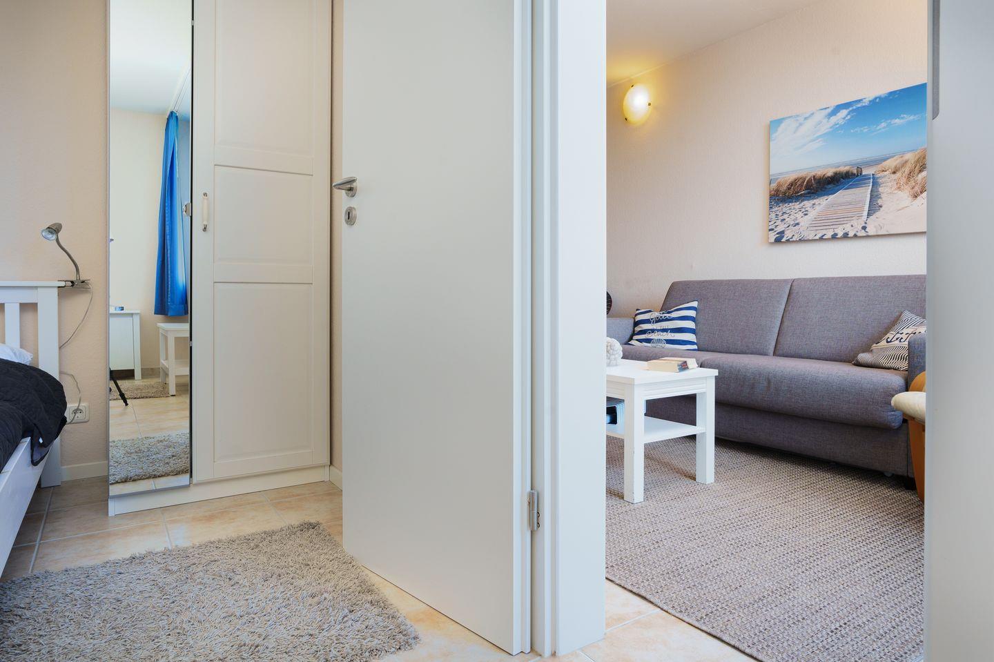 (Doppelbettcouch), kleine Küche mit Essplatz, kleiner Flur mit Garderobe, TV,