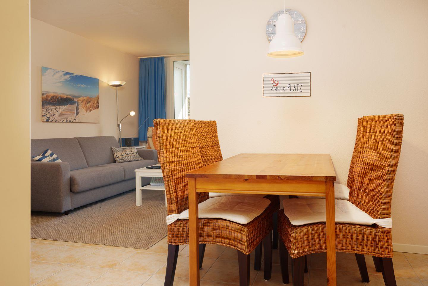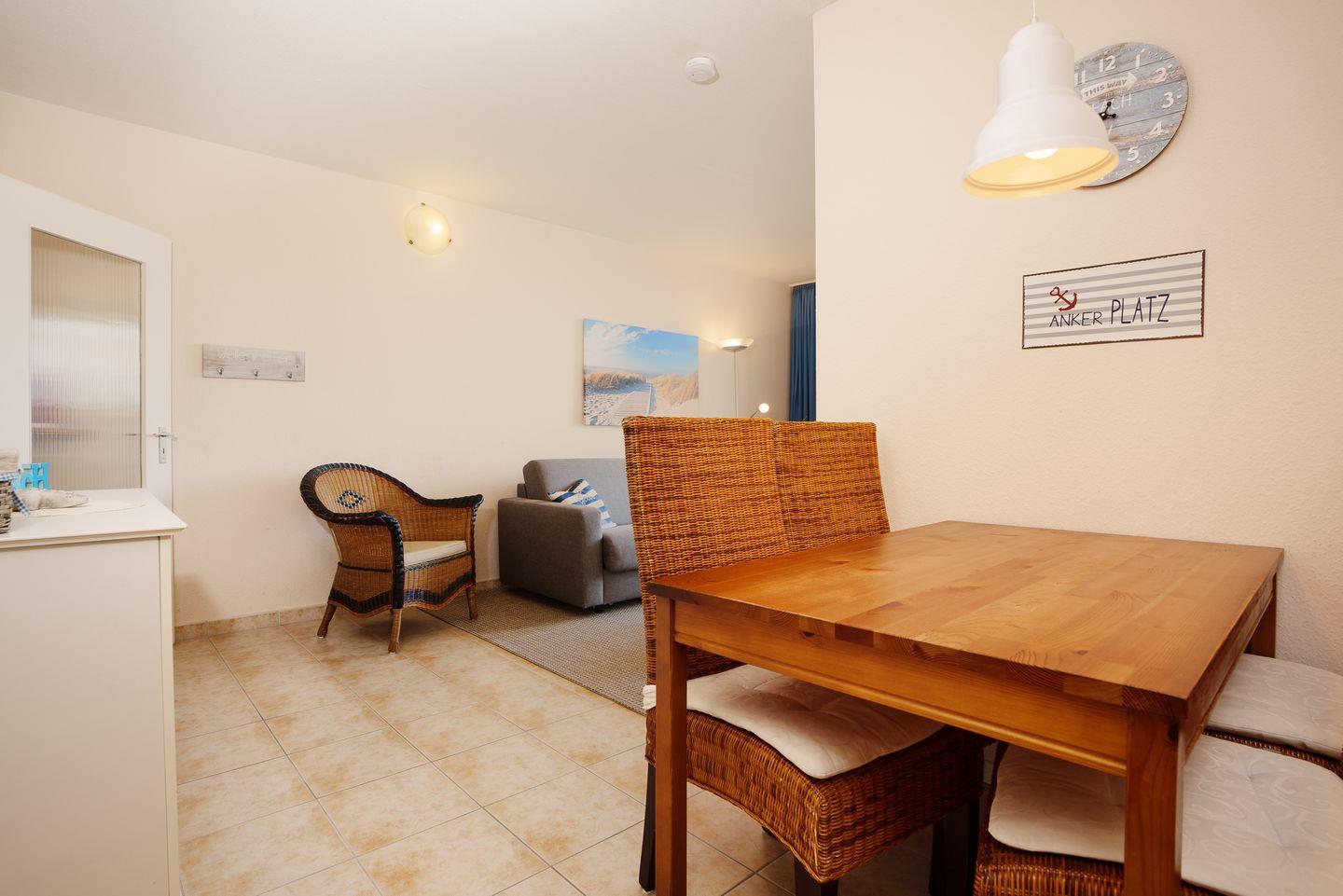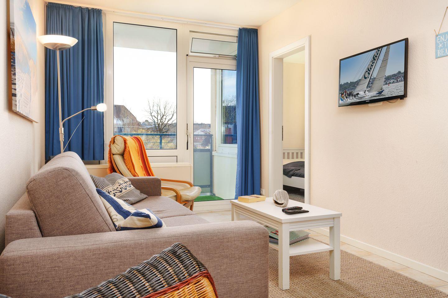 Der Wohnbereich ist gemütlich und lädt zum Entspannen ein. Die Sofaecke ist perfekt für einen gemütlichen Abend – ob mit einem guten Buch oder einem Film im TV. Und wenn du einfach nur frische Luft schnappen willst, öffnest du die Balkontür und genießt den Blick auf Laboe und die salzige Meeresbrise.