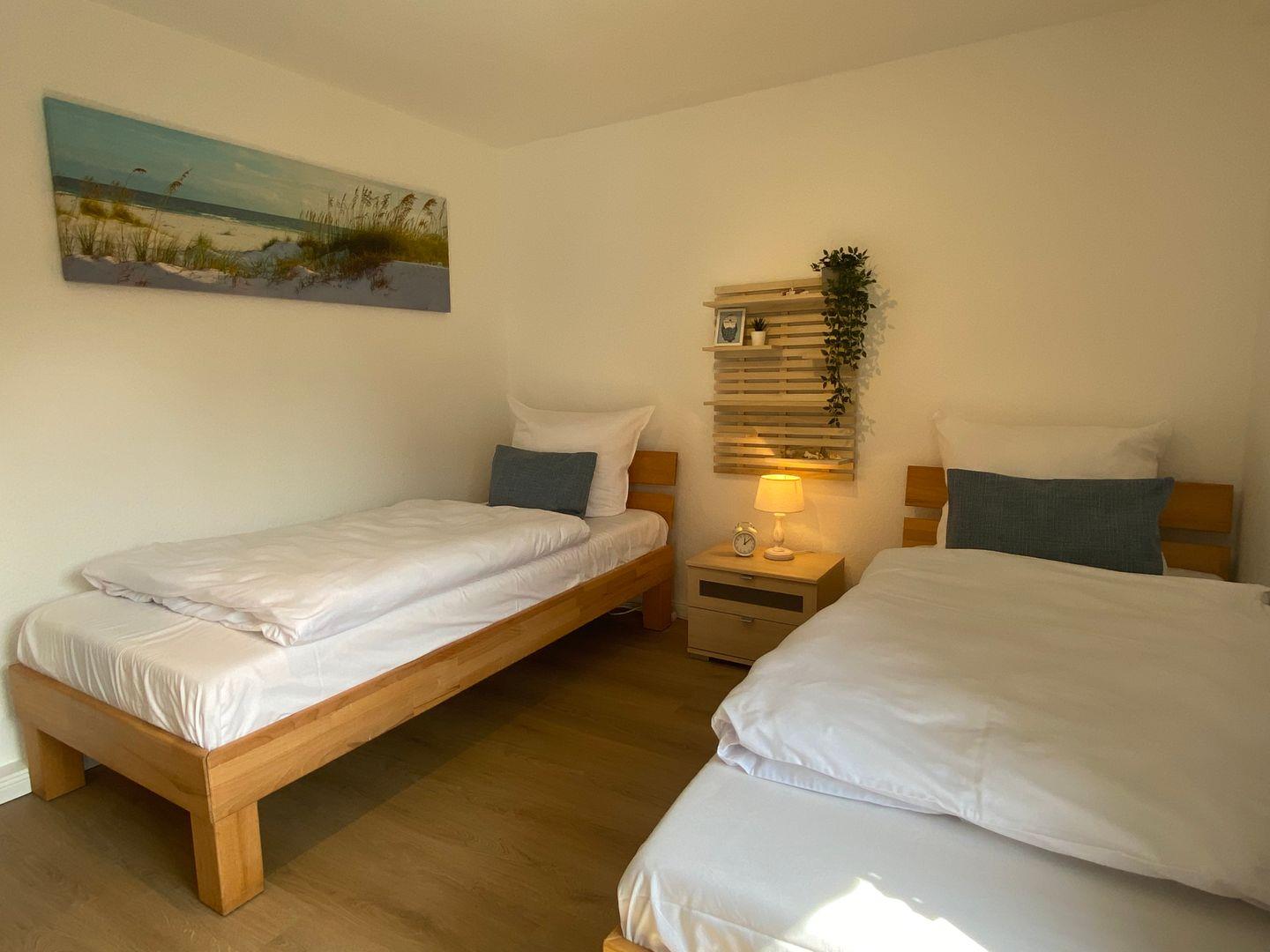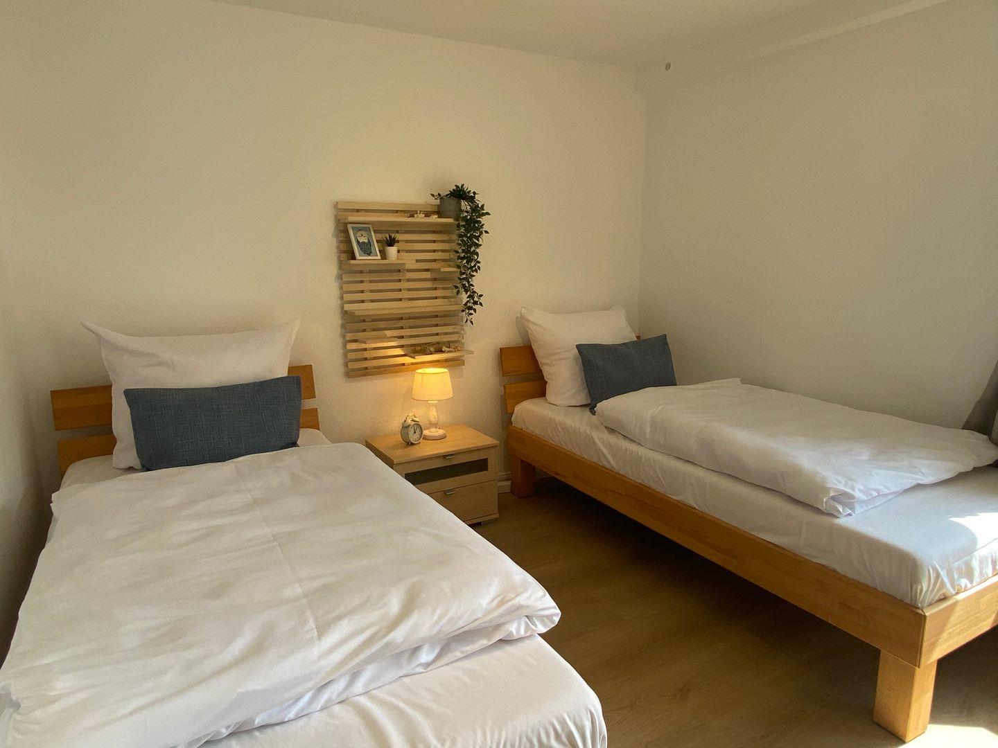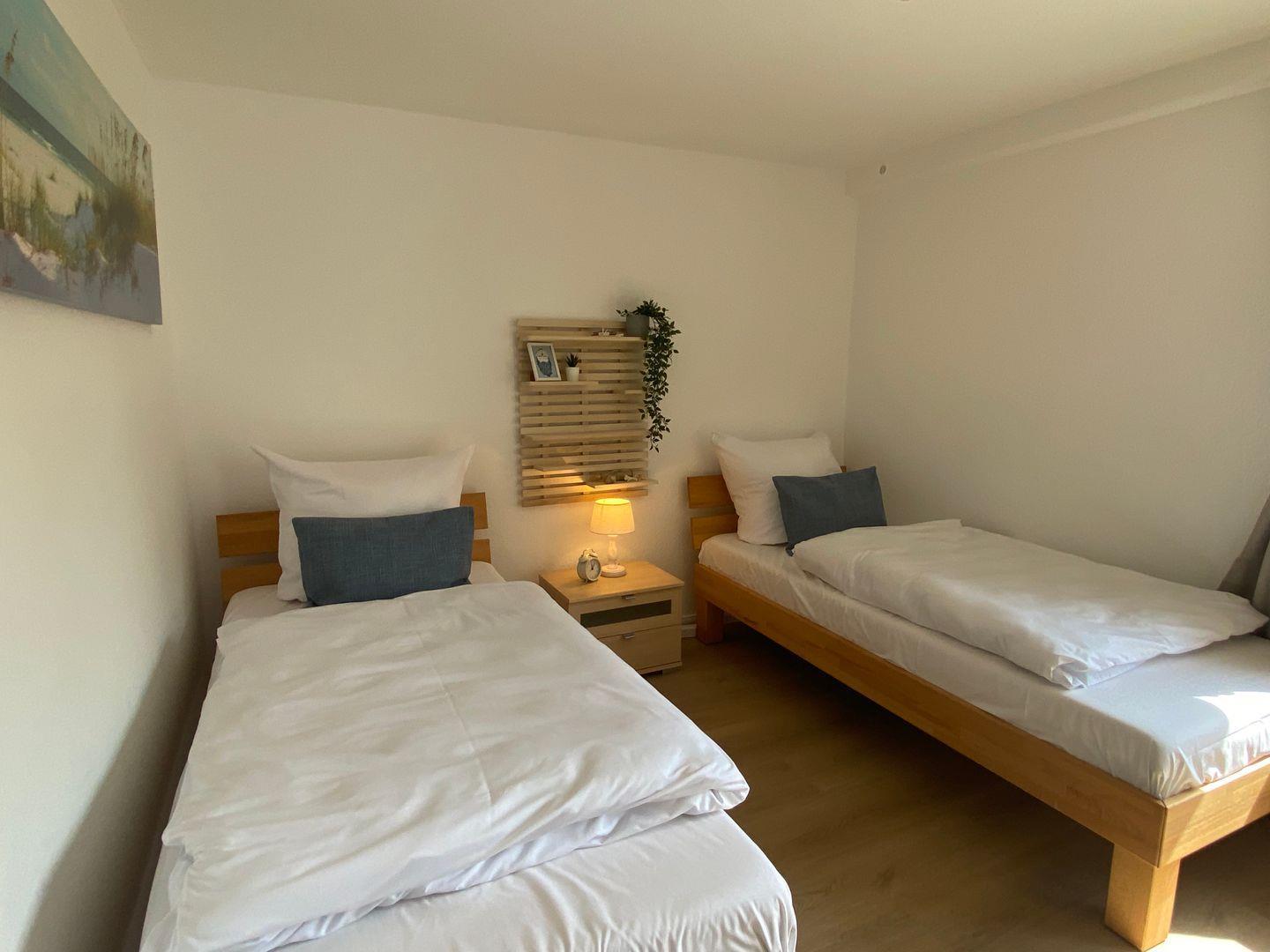 Das Schlafzimmer ist mit zwei Einzelbetten möbliert und bietet dir eine ruhige Schlafumgebung. Das Badezimmer verfügt über eine Dusche und WC – schlicht, funktional und gepflegt.