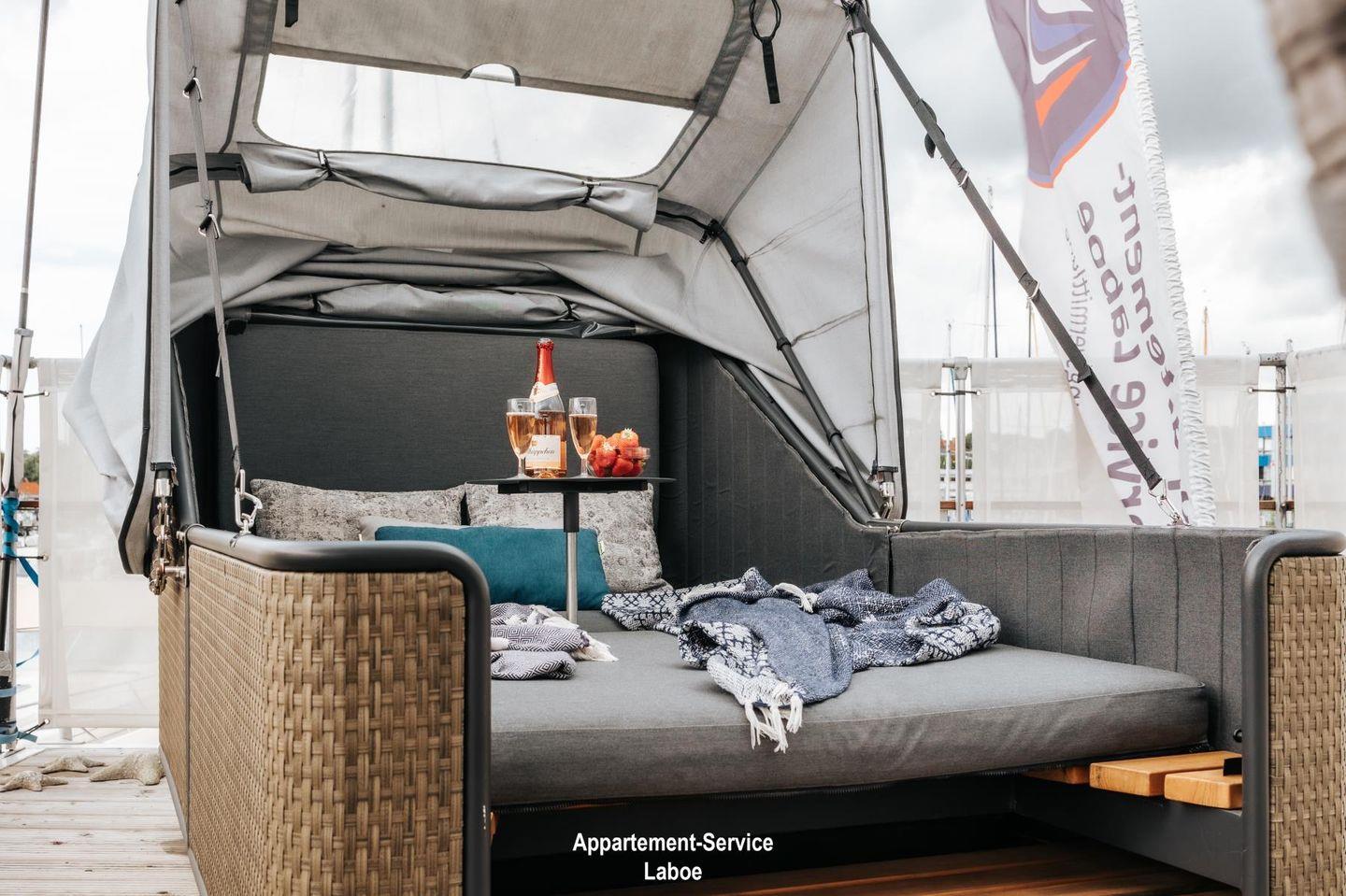 Das Hausboot verfügt über zwei Terrassen, die das Outdoor-Erlebnis besonders machen. Eine kleinere Terrasse auf Wasserhöhe lädt zu romantischen Dinnern bei Sonnenuntergang ein. Die großzügige Dachterrasse mit 40 m² bietet dir ein Highlight mit Deutschlands einzigem Schlafstrandkorb auf dem Wasser, einer Yoga-Ecke, Hängesesseln und Bambuspflanzen. Hier kannst du die Seele baumeln lassen und die Weite der Förde genießen.