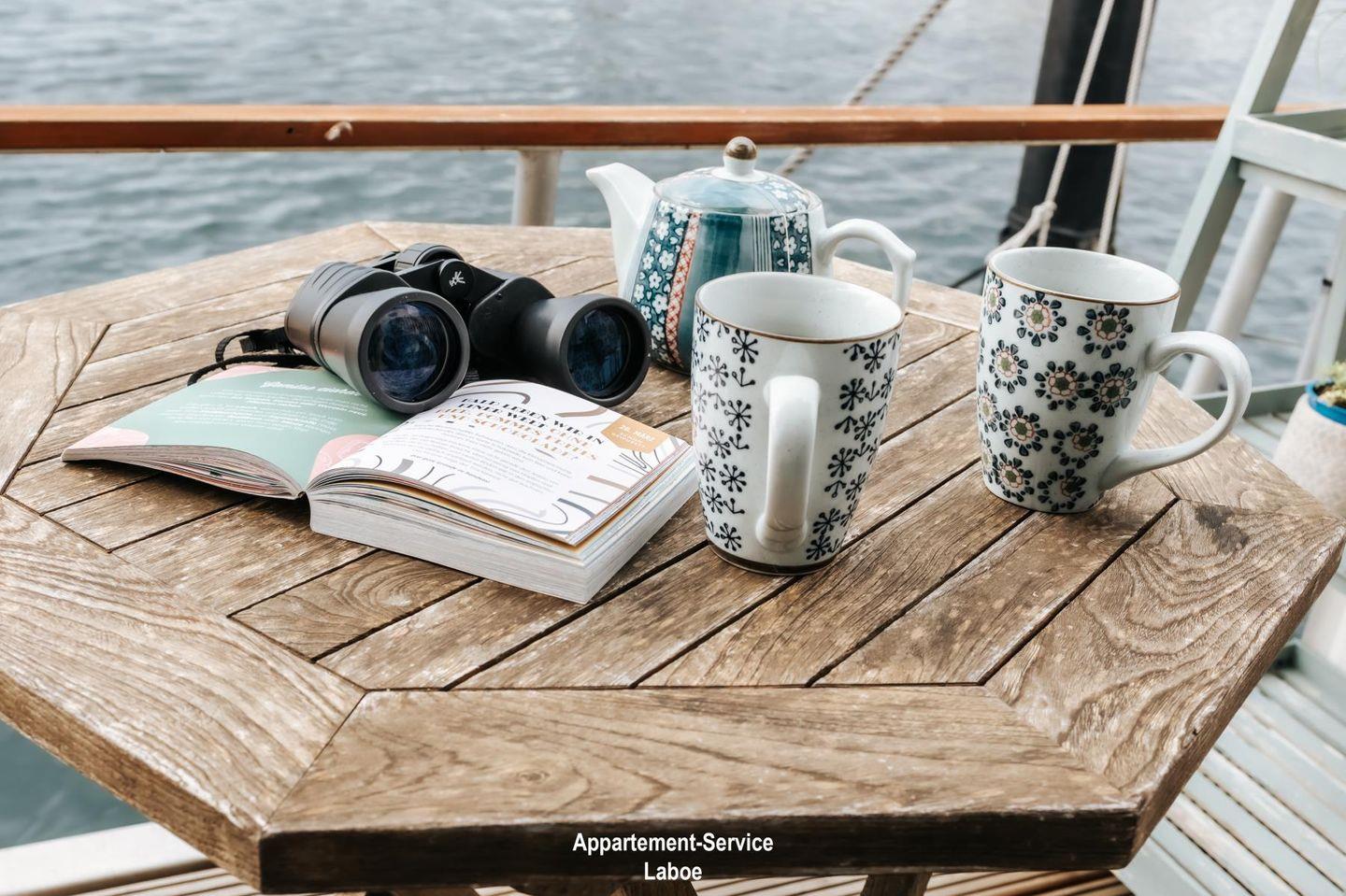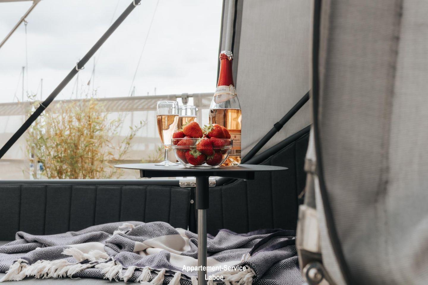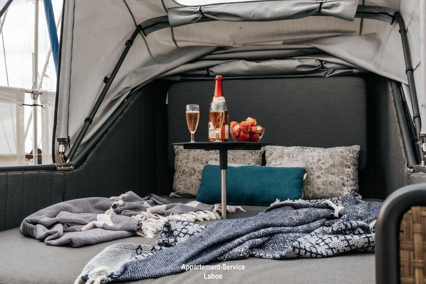 Erleben Sie stilvolles Boho-Hausboot Canoga mit Panoramablick und großer Dachterrasse direkt an der Kieler Außenförde.