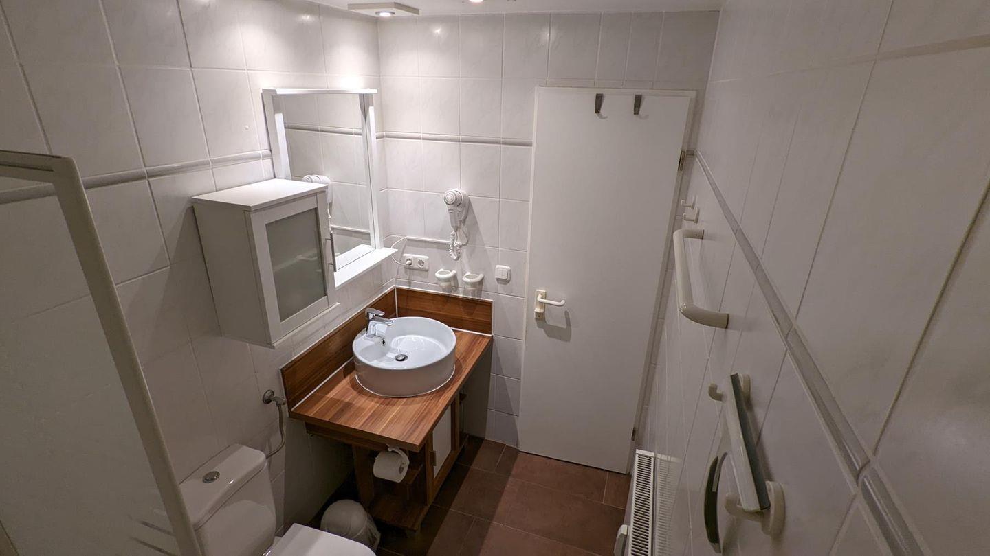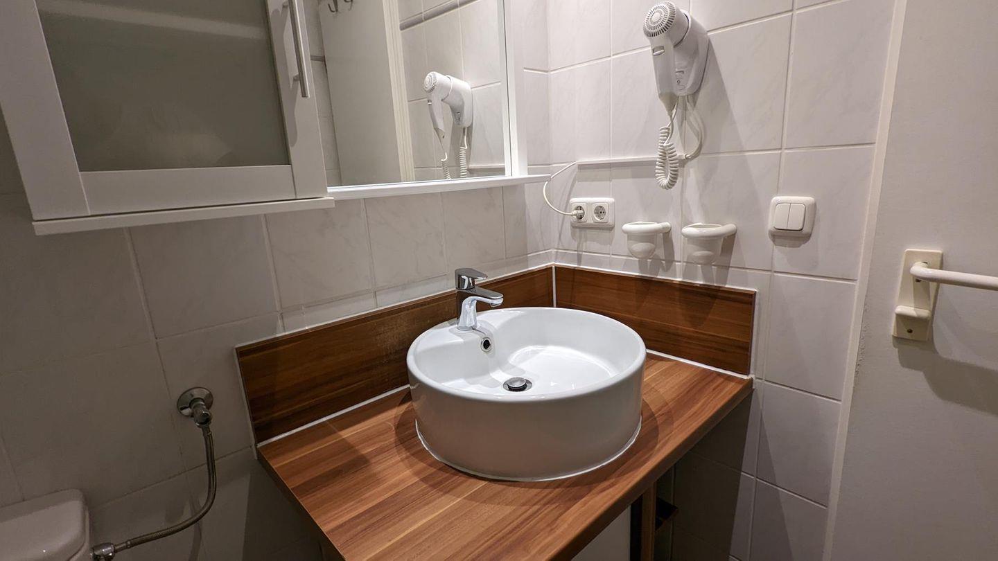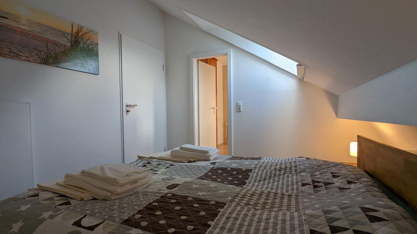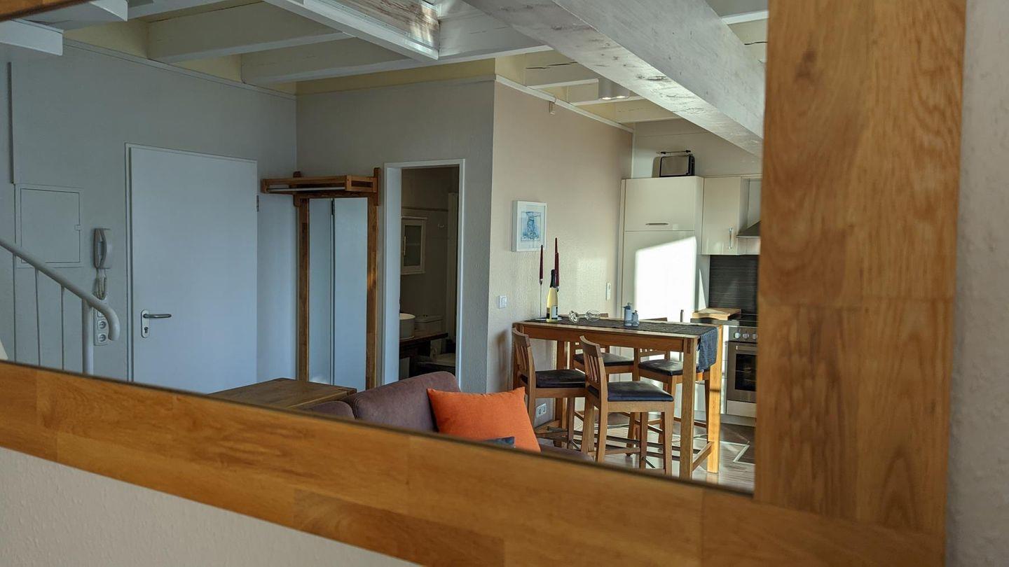 Die Wohnung selbst erstreckt sich über 40?m² und zwei Ebenen – mit genug Platz für bis zu drei Personen. Im unteren Bereich findest du das Wohnzimmer mit gemütlicher Sofaecke und Zugang zum Balkon. Die Schlafcouch eignet sich gut als weiterer Schlafplatz für zwei Personen.