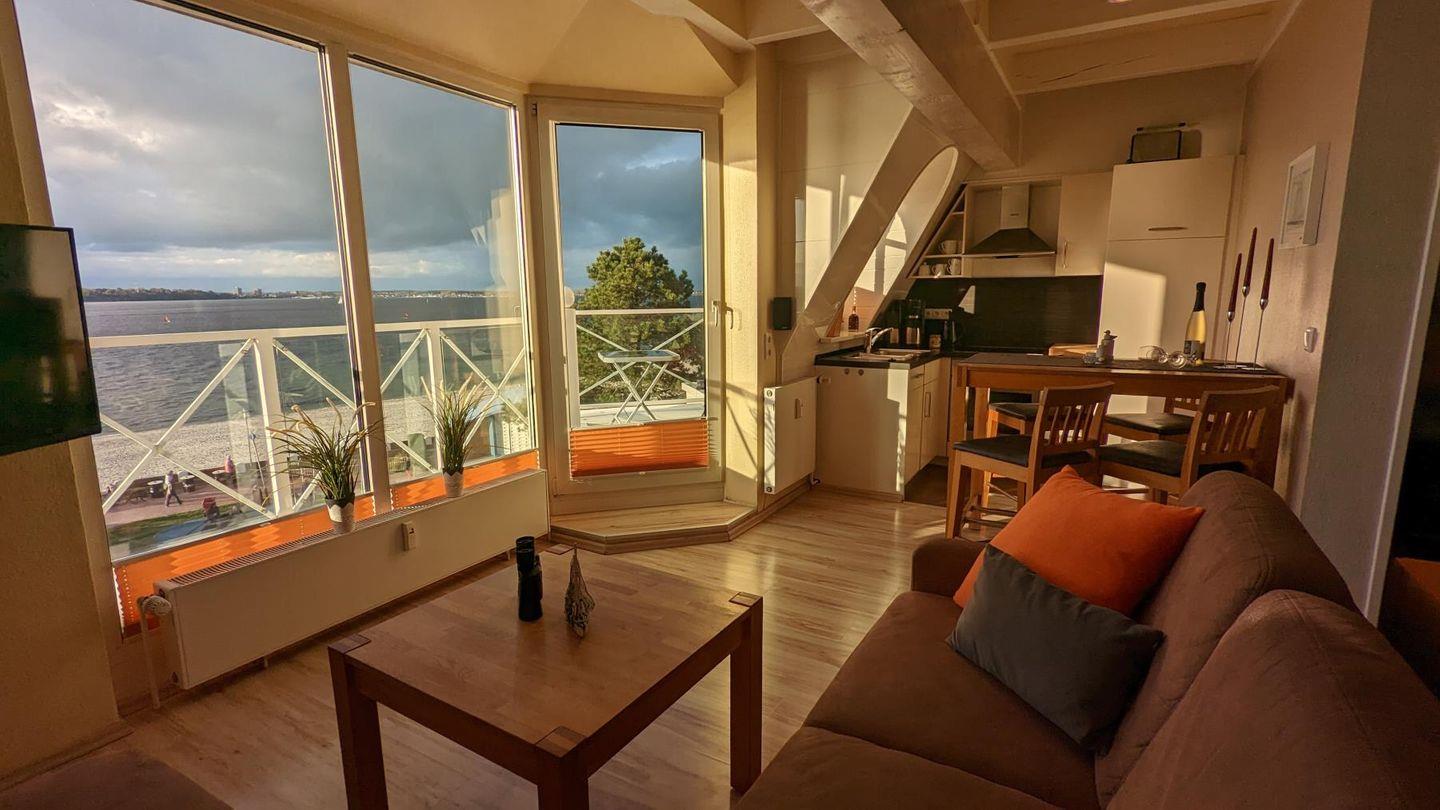 Ferienwohnung Strandkoje: Haus "Hotel Panorama", 1. Reihe an der Strandpromenade mit Meerblick, Maisonettewohnung im 2. OG, ca. 40?m², für bis zu 3 Personen, kombinierter Wohnbereich mit Schlafcouch, Balkon mit Panoramablick über die Förde, offene Küche mit Essplatz, Dusch-/Wannenbad, offene Empore mit Leseecke, separates Schlafzimmer mit Doppelbett in der oberen Ebene, Tiefgaragenstellplatz, Aufzug im Haus