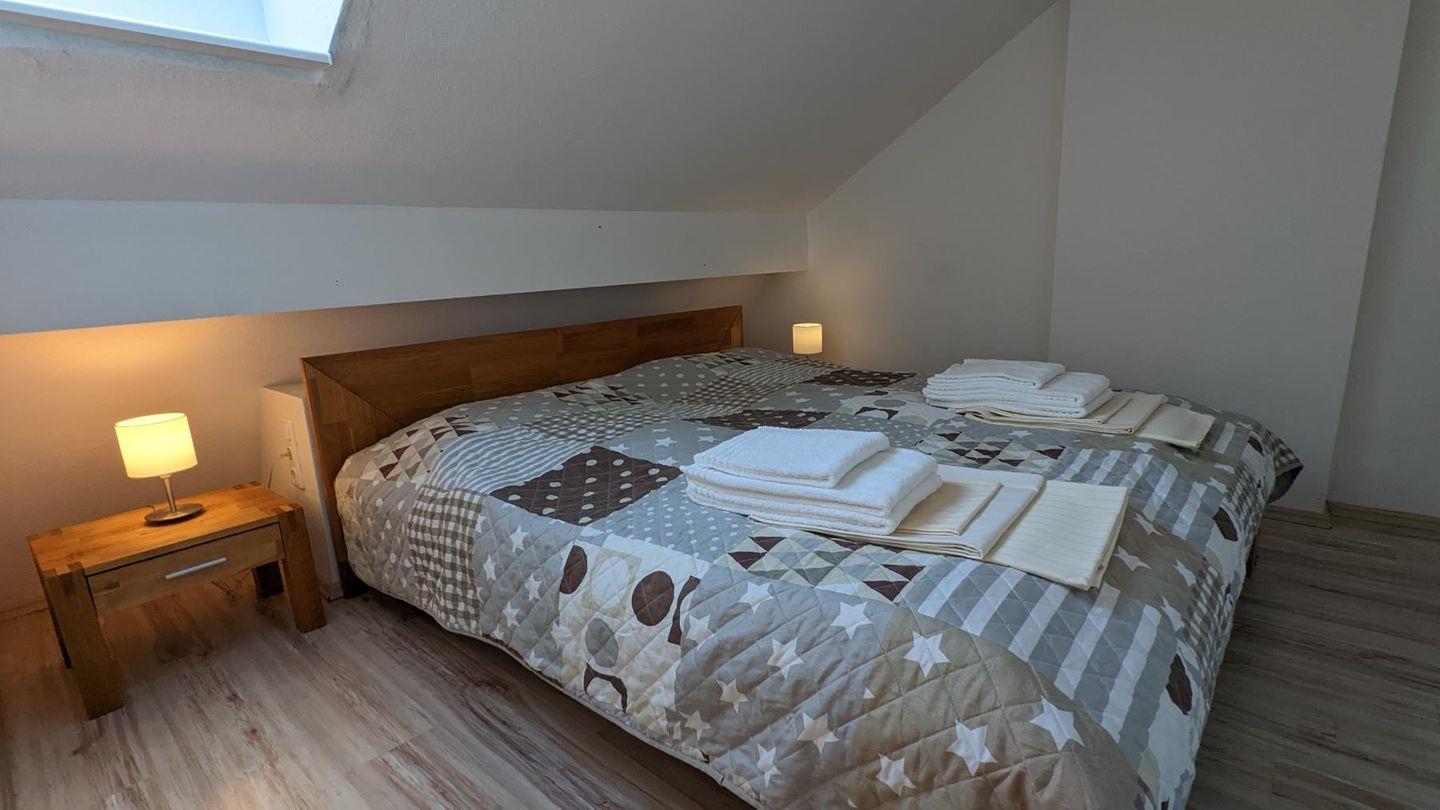 Oben auf der Empore gibt’s eine kleine Leseecke – ein stiller Ort für dich, ein Buch und eine Tasse Tee. Dahinter liegt das separate Schlafzimmer mit Doppelbett – ruhig, gemütlich und perfekt zum Ausschlafen.