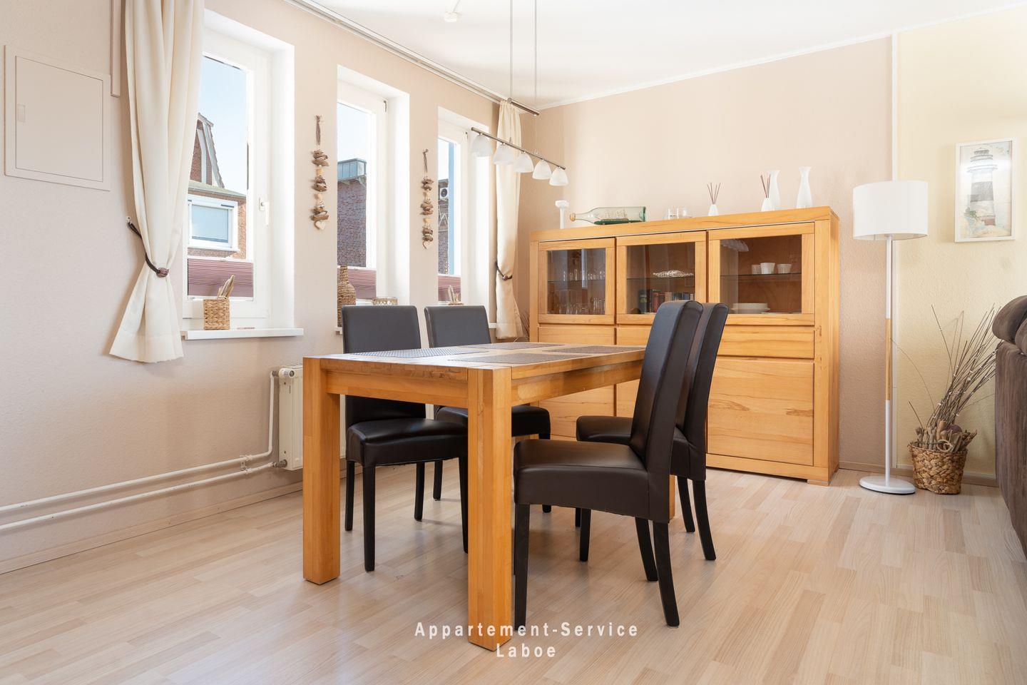 Die Ausstattung ist gepflegt und hochwertig. Möbel renommierter Marken wie Sit, Scan-Brocke, Voss und Nolte, ein Parador-Laminatboden, ein Federkernsofa sowie liebevolle Details sorgen für ein wohnliches Ambiente mit Qualität. Das Badezimmer mit Dusche und Föhn ist modern und zweckmäßig.