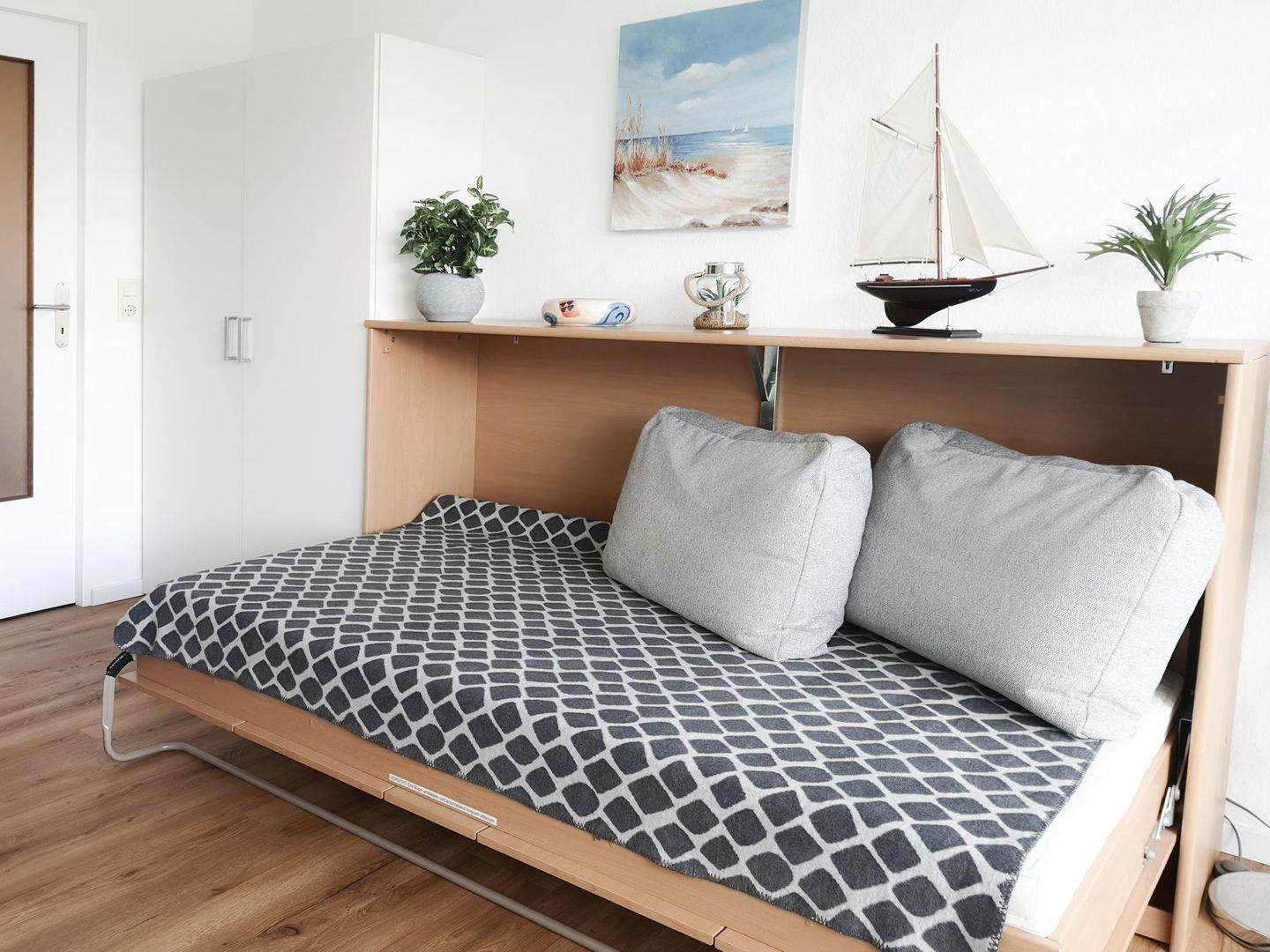 Die Wohnung bietet flexible Schlafmöglichkeiten, ob auf der hochwertigen Schlafcouch, die sich schnell in ein Doppelbett verwandeln lässt, oder dem Schrankbett – gemütliche Auflagen, Kissen und Decken stehen dir selbstverständlich zur Verfügung. Bettwäsche kannst du entweder selbst mitbringen oder bequem gegen eine kleine Leihgebühr vor Ort erhalten.