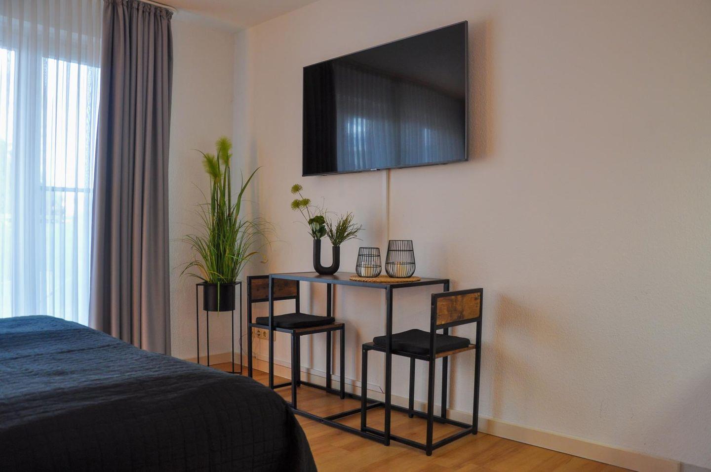 Das Apartment befindet sich in der Hochparterre und bietet auf rund 28 m² alles, was du für eine entspannte Auszeit brauchst. Der kombinierte Wohn- und Schlafraum ist funktional und gemütlich zugleich. Ein komfortables Doppelbett, ein kleiner Essbereich und ein HD-TV schaffen eine angenehme Atmosphäre, in der du dich schnell wohlfühlst. Vom Zimmer aus gelangst du direkt auf den Balkon zur Landseite. Dort wartet ein ruhiger Platz an der frischen Luft auf dich, perfekt für einen Kaffee am Morgen oder ein Glas Wein am Abend.