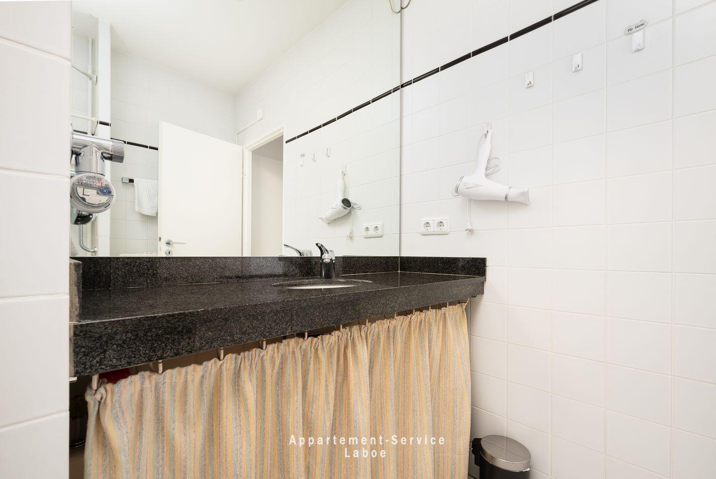 2-Zimmer-Wohnung über 58 m² im 1. OG mit Meerblick, Wohnzimmer mit gemütlicher Sitzgruppe (Doppel-Schlafcouch) und TV, möblierte Loggia, offene Küchenzeile mit Gefrierkombination und Geschirrspüler, Schlafzimmer mit Doppelbett (180 x 200), Badezimmer mit Dusche und WC, kleiner Flur mit Garderobe, W-Lan, Pkw-Außenstellplatz