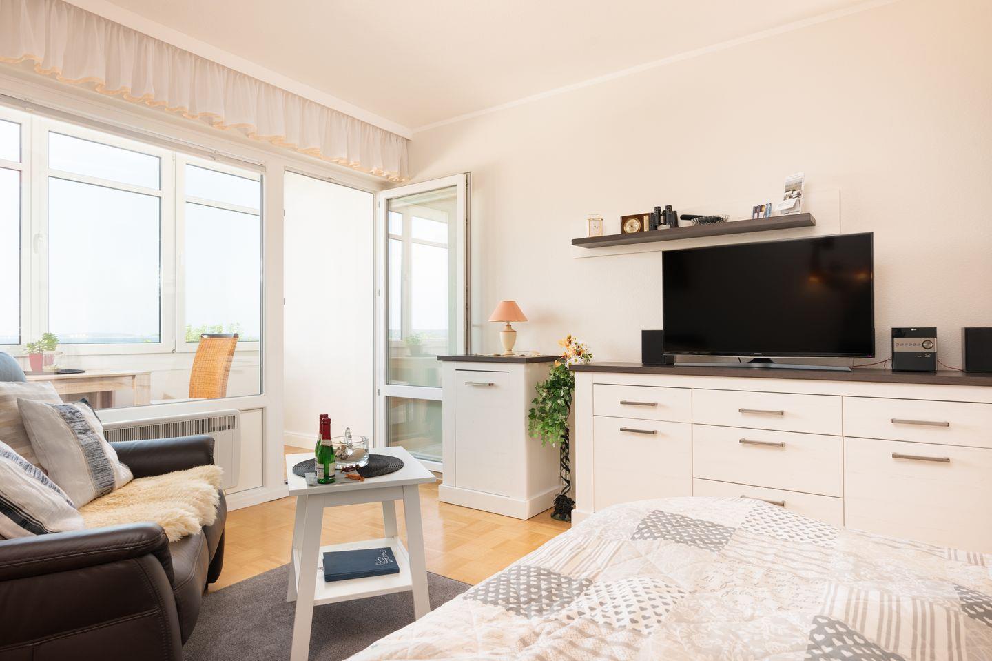 Ferienwohnung "Förde-Traumblick 3" im 2. Stock direkt in erster Reihe am Strand von Laboe: 1 Zimmer Wohnung bis zu 2 Personen,kombiniertes Wohnschlafzimmer mit gemütlicher Sitzgruppe und Doppelbett, Essplatz in der Loggia mit perfektem Meerblick, volleingerichtete Küche mit Geschirrspüler, TV, Wlan, Dusche/WC, PKW-Stellplatz direkt am Haus