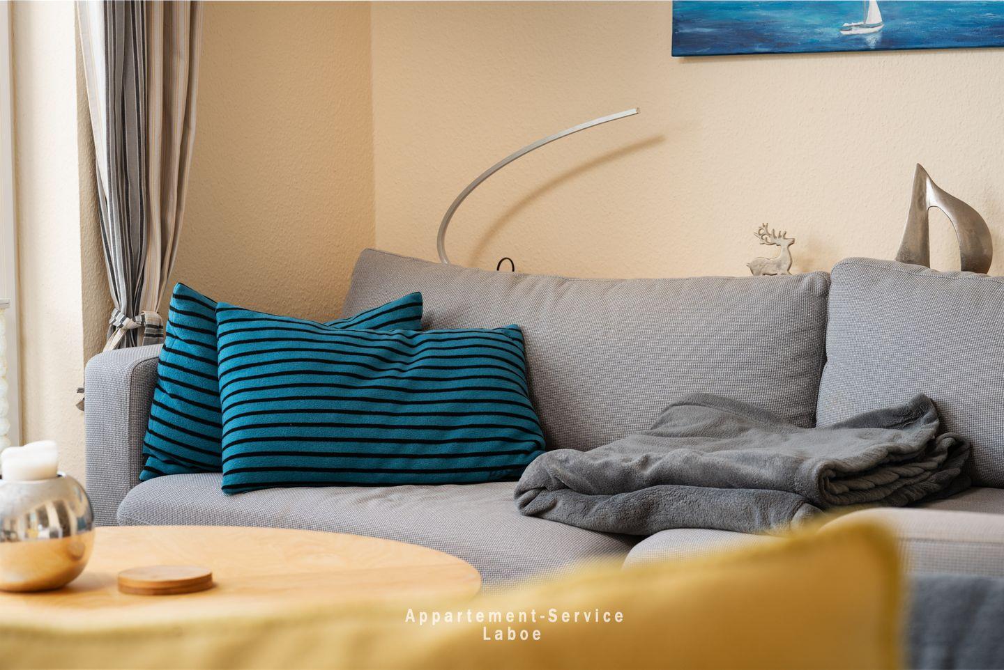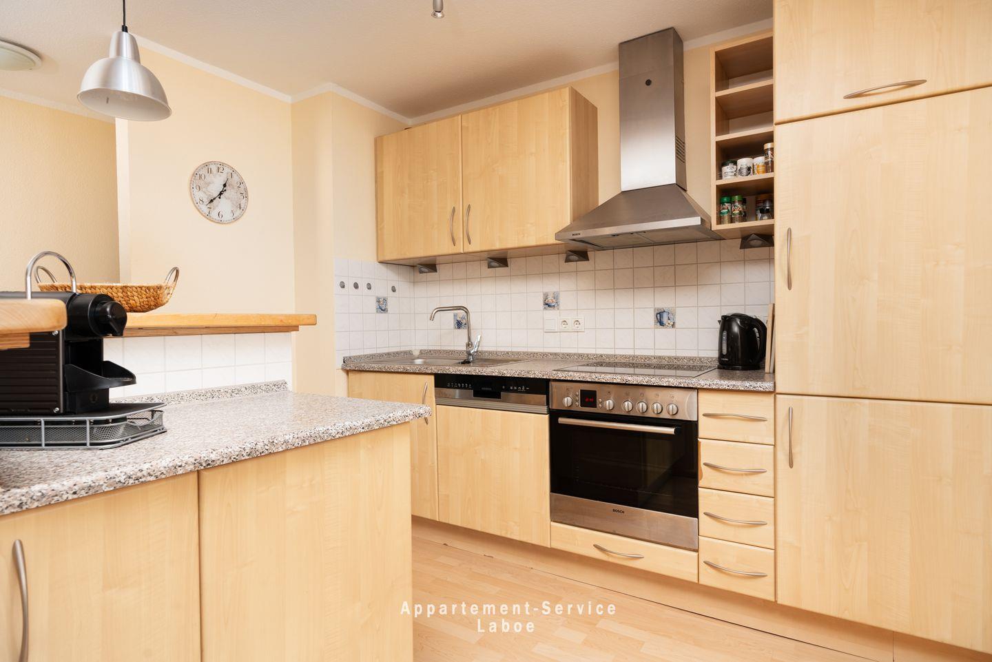 FeWo Hafenblick 4: Dreizimmerwohnung mit 67?m² für bis zu 4 Personen im maritimen Zentrum von Laboe. Wohnzimmer mit Sitzgruppe, TV, WLAN, Hafenblick. Voll ausgestattete Küche mit Geschirrspüler, Essplatz. Zwei Schlafzimmer: eins mit Doppelbett, eins mit zwei Einzelbetten. Modernes Bad mit Dusche, geräumiger Flur mit Garderobe. Strandkorb am Strand (Apr–Sept) inklusive. Außenstellplatz am Haus. Nichtraucher, Haustiere erlaubt