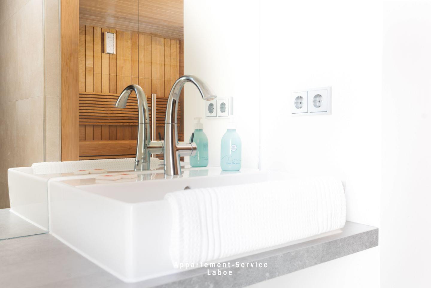 Das Hausboot bietet zudem ein Schlafzimmer mit einem komfortablen Doppelbett, in dem du wunderbar zur Ruhe kommst. Das moderne Duschbad mit WC und Waschbecken ist praktisch und stilvoll gestaltet. Und das Beste? An Bord gibt es eine private Sauna, in der du nach einem Tag am Strand oder einem Ausflug nach Laboe so richtig abschalten kannst.