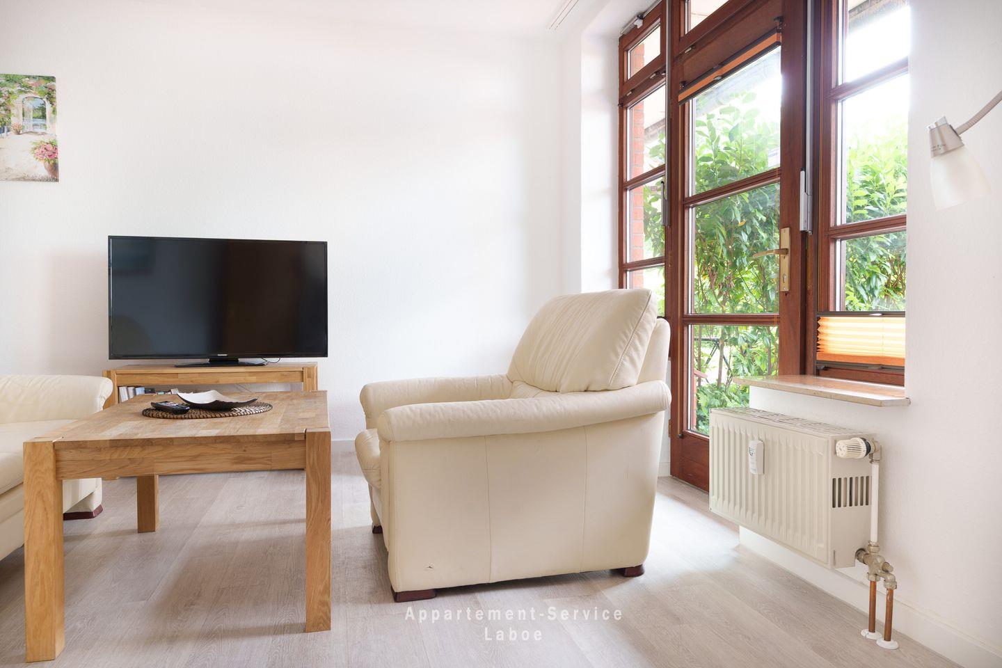 FeWo Sandkorn in Laboe: Komfortable 3-Zimmer-Wohnung nur 50 m vom Strand entfernt mit Terrasse und eigenem Strandkorb.