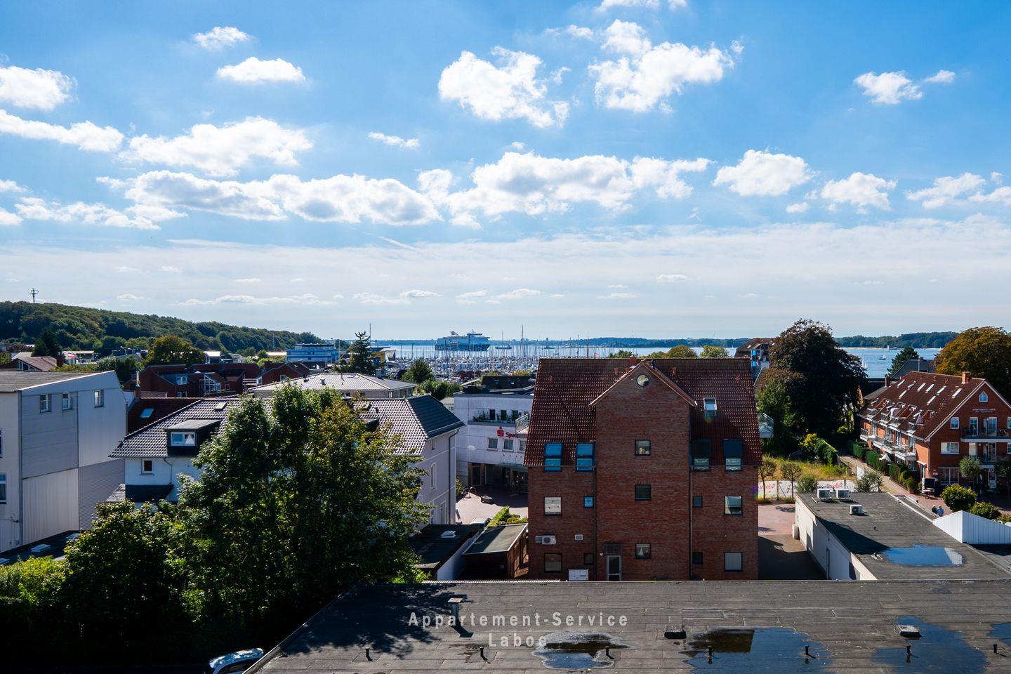 FeWo FördePanorama: 3-Zimmer-Wohnung mit ca. 46?m² im 5.?OG, ideal für 4?Erwachsene + 1?Kind. Wohnzimmer mit Sofaecke, Essplatz, TV, WLAN und Balkon mit Panoramablick auf die Ostsee. Offene Küche mit Induktionskochfeld, Airfryer, Kühlschrank, Spülmaschine, Kaffeemaschine und Wasserkocher. Zwei Schlafzimmer: eins mit zwei Boxspringbetten, eins mit zwei Einzelbetten und zusätzlichem Unterbett. Modernes Duschbad. Parkplatz inklusive, Haustiere erlaubt. Fahrstuhl bis zum 4.?OG, letzte Stockwerk zu Fuß. Strand, Promenade, Hafen und Restaurants in direkter Nähe.