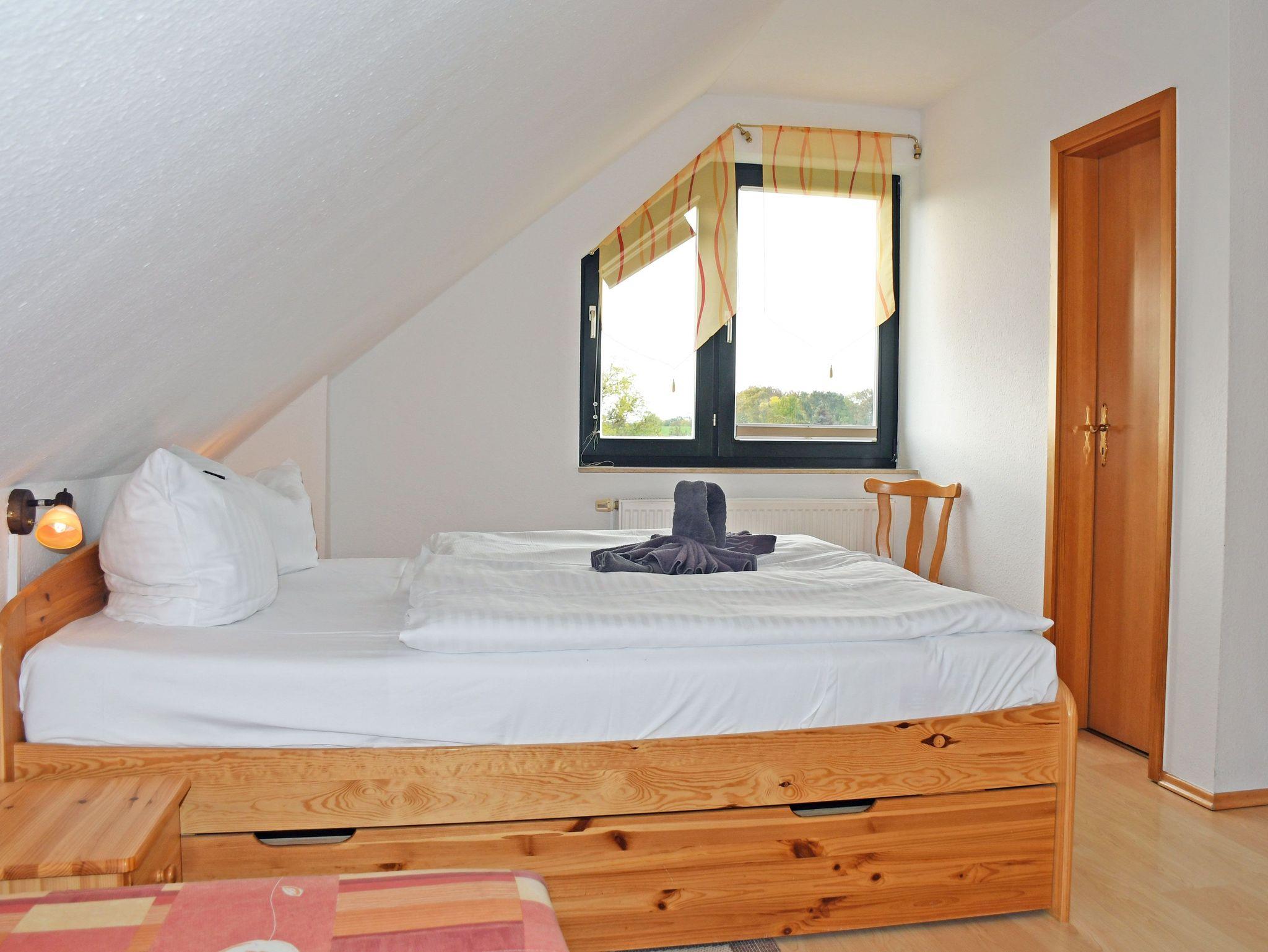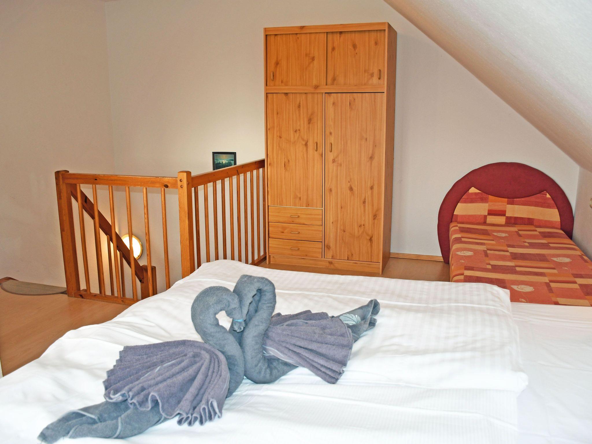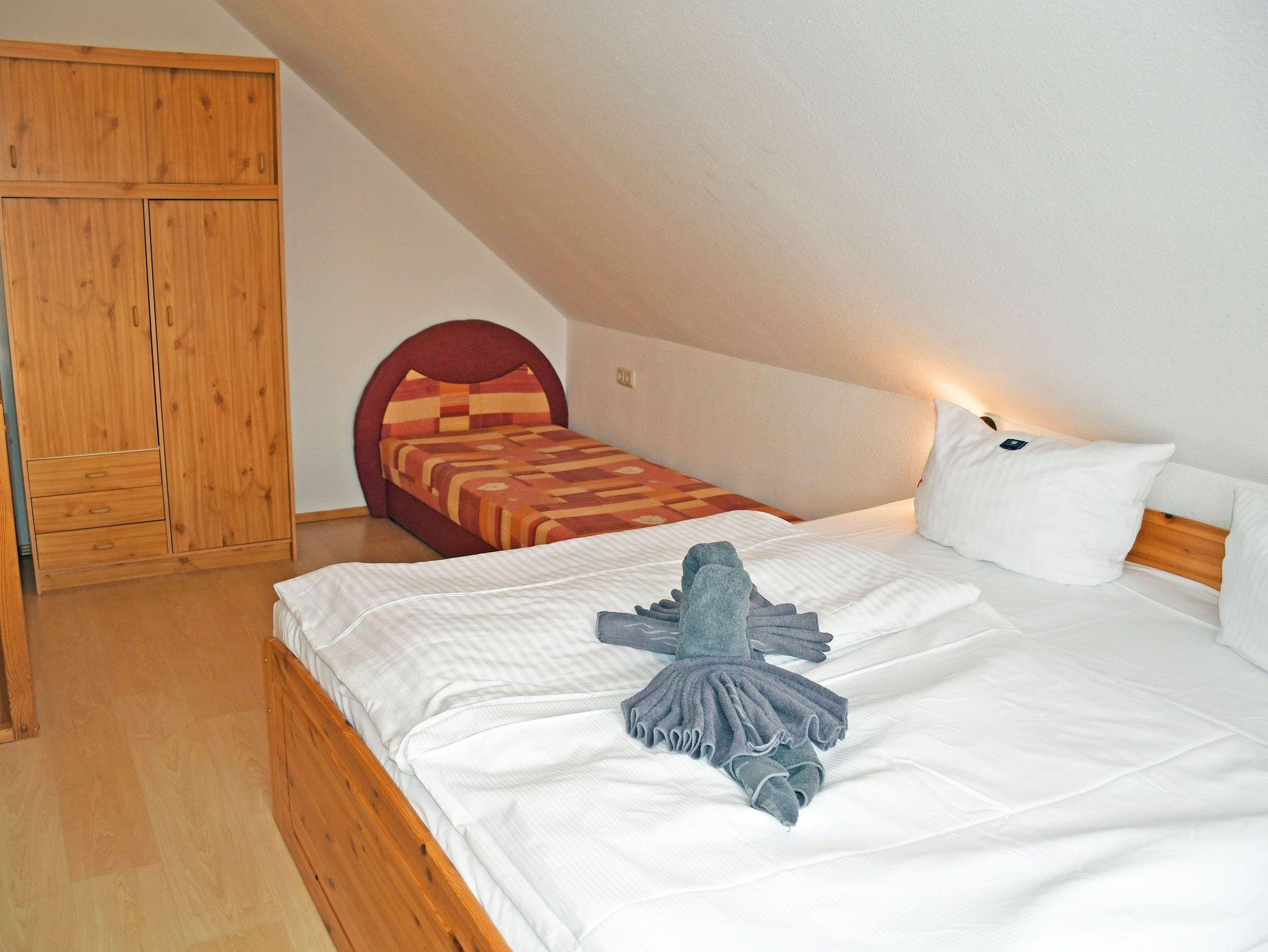 Schlafzimmer mit Doppelbett und Einzelbett, DU/WC im DG