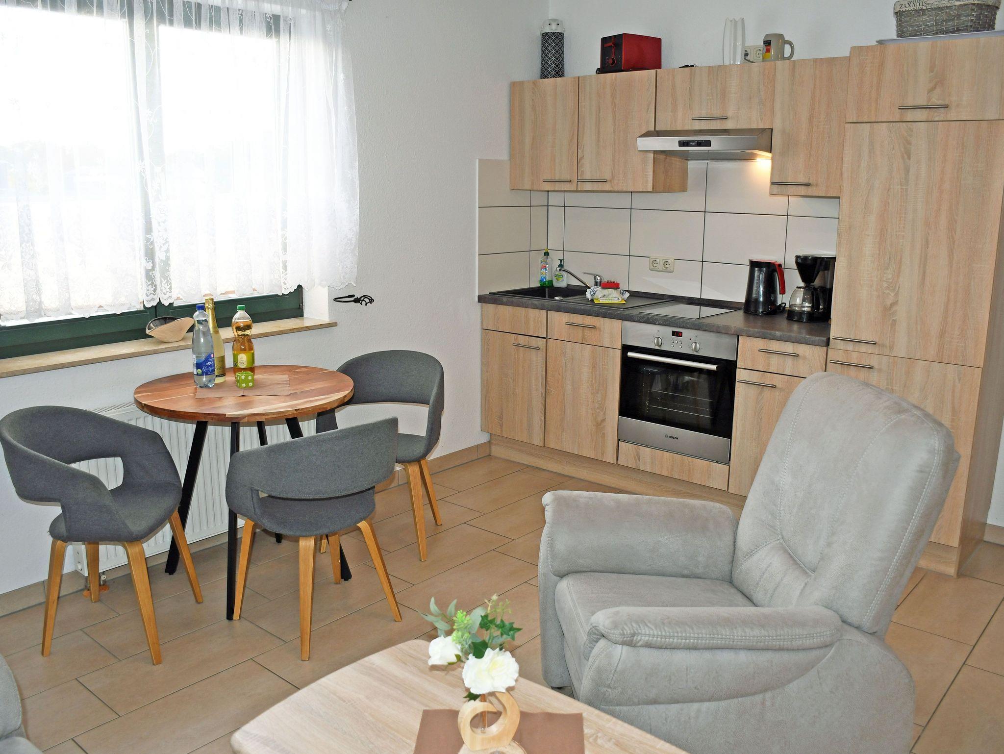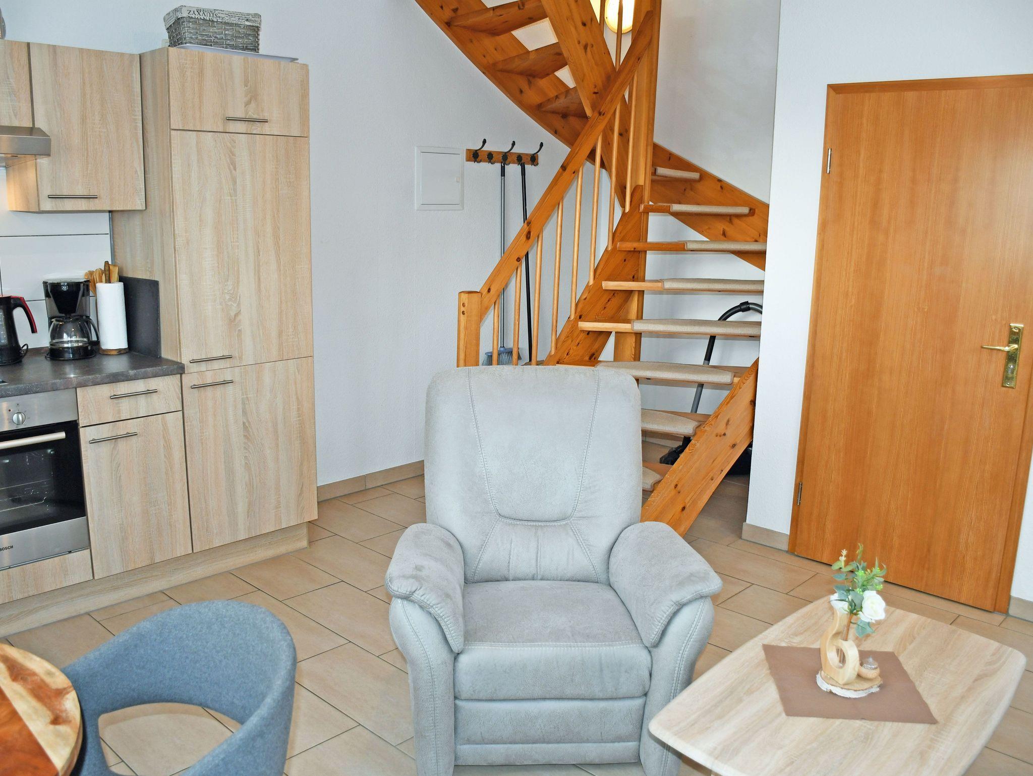Über einen separaten Eingang gelangt man in das Erdgeschoss mit dem Wohnzimmer. Diese verfügt über eine Sitzcouch mit Tisch und Sesseln, ein Esstisch mit Stühlen, ein TV-Gerät und Ablageschränken. Weiterhin befindet sich im Erdgeschoss eine Küchenzeile die mit Herd, Backofen, Mikrowelle, Spülmaschine, Wasserkocher, Kaffeemaschine, Toaster und Kühlschrank komplett ausgestattet ist.