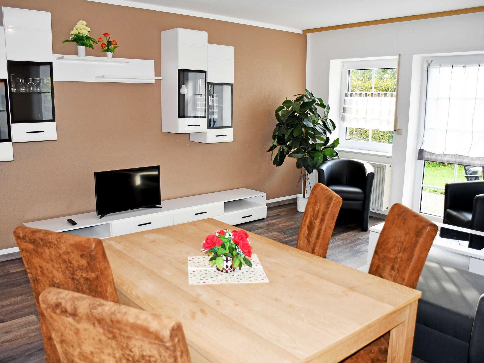 Im Wohnraum befinden sich eine bequeme Sitzcouch mit Tisch, Sessel und ein TV-Gerät. Hier steht auch ein Esstisch mit Sitzgelegenheiten.
