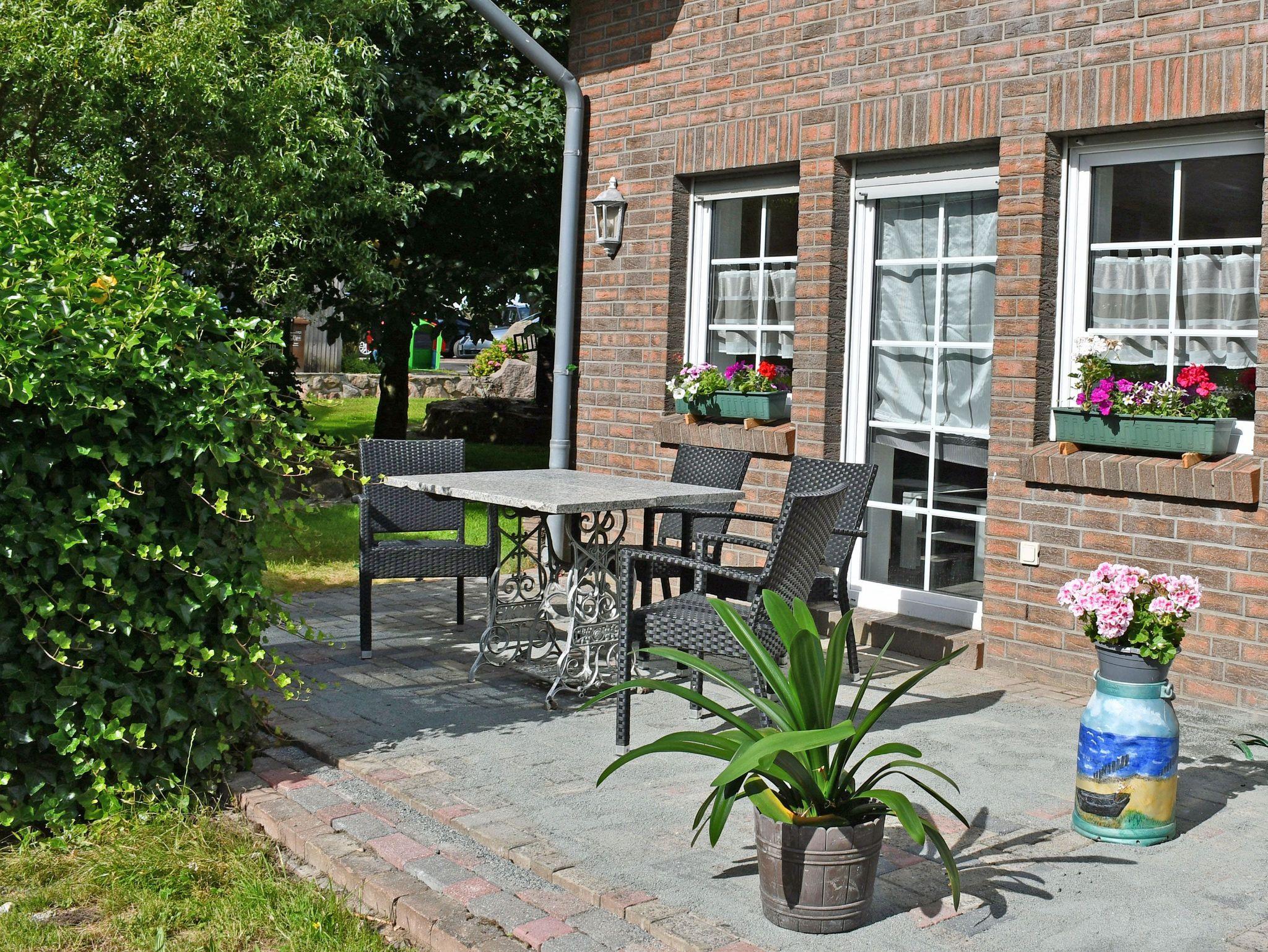 Zu diesem Appartement im Erdgeschoss gehört auch eine Terrasse mit Gartenmöbeln und Ausblick.
