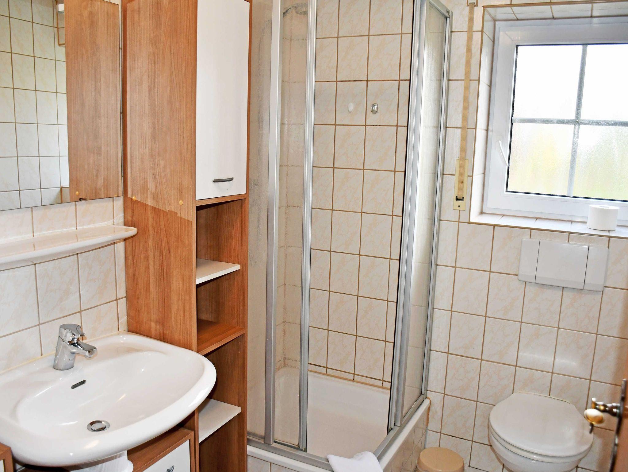 Das Bad ist mit Dusche, WC und Waschtisch ausgestattet.