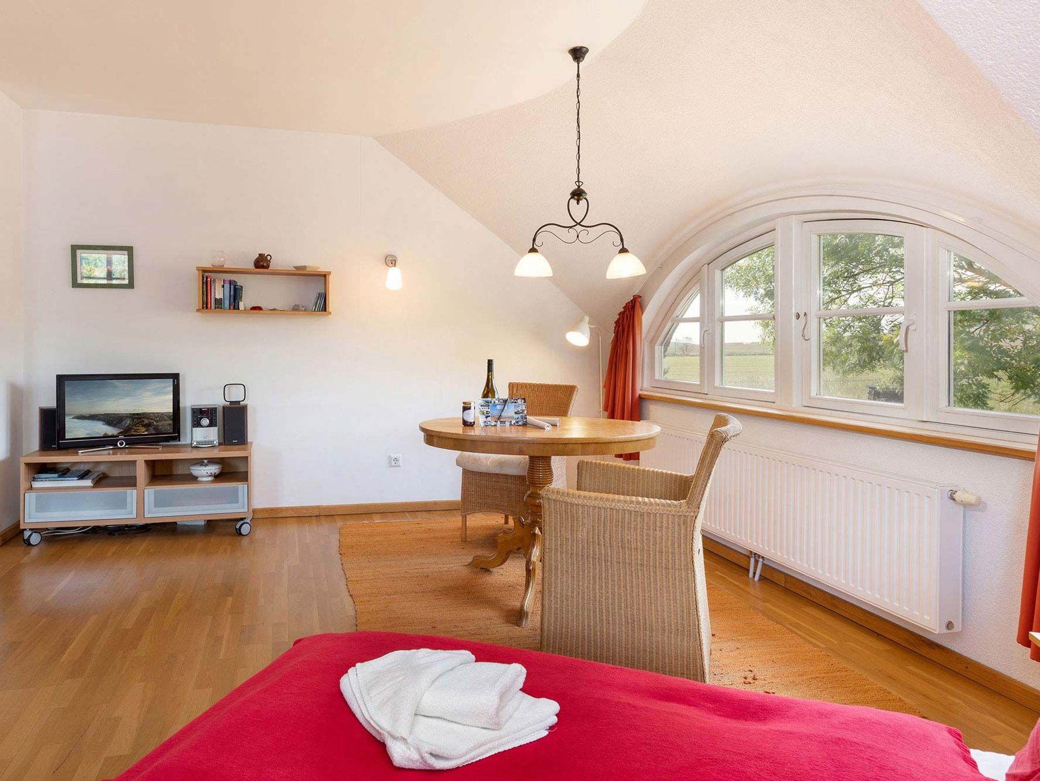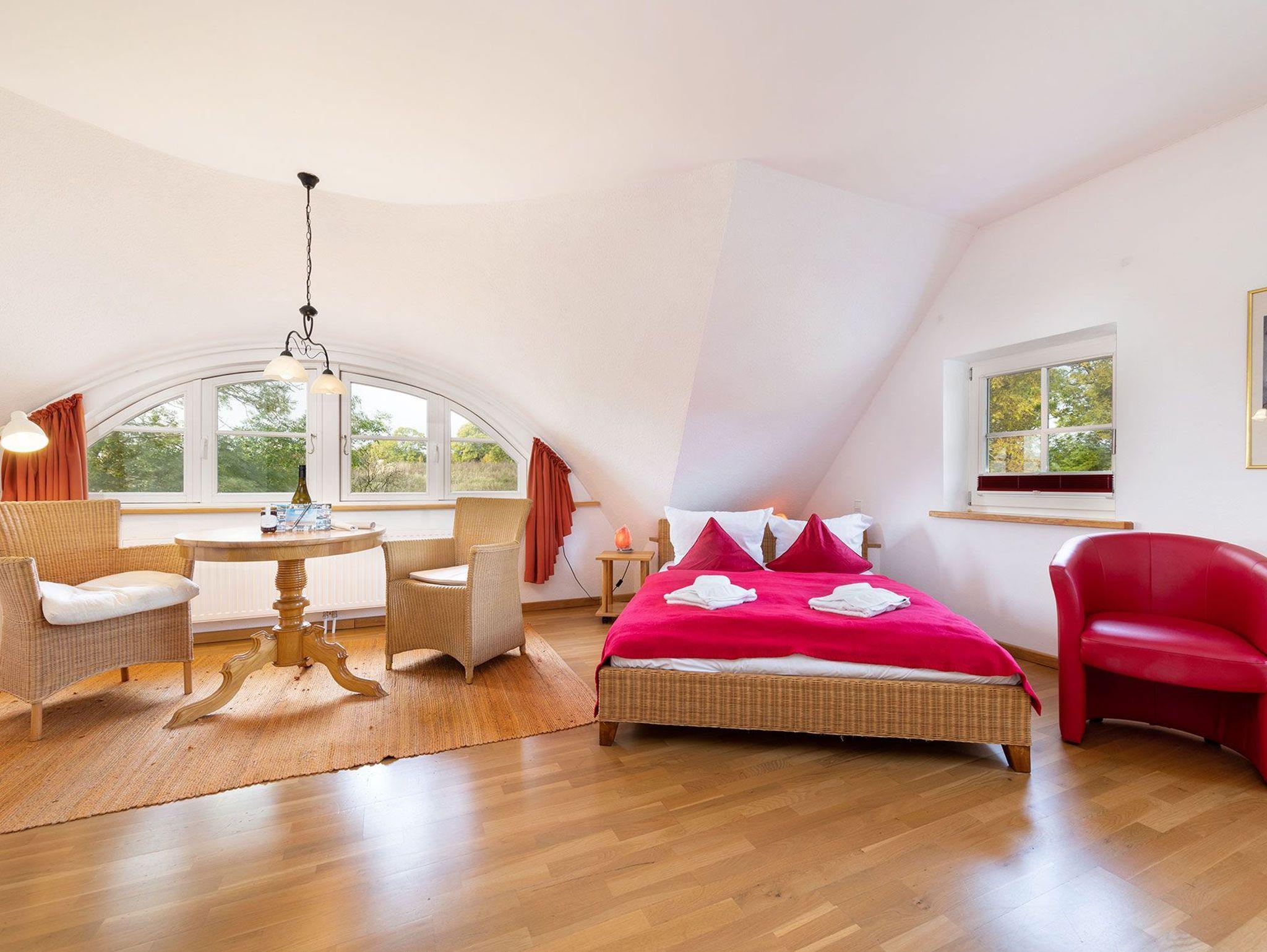 „Die kleine Rote“ ist die ideale Ferienwohnung für ruhesuchende Alleinreisende, aber auch für frisch Verliebte und Paare, die inmitten herrlicher Natur Harmonie und Zweisamkeit genießen möchten. Romantische Dachschrägen, angenehme Naturtöne und das traumhafte Gaubenfenster lassen Ihr Urlaubsdomizil in einladendem Licht erstrahlen. Und damit Sie sich hier auch außerhalb der sommerlichen Badesaison so richtig wohlfühlen können, haben Ihre freundlichen Gastgeber an alles gedacht: Auf den rund 40 liebevoll eingerichteten Quadratmetern Wohnfläche erwarten Sie neben einem kuschligen Doppelbett (140x200cm), einer komplett ausgestattete Küchenzeile und einem schönen Wannenbad auch ein moderner Flachbild-TV, Radio/CD-Player und kostenfreies W-LAN.