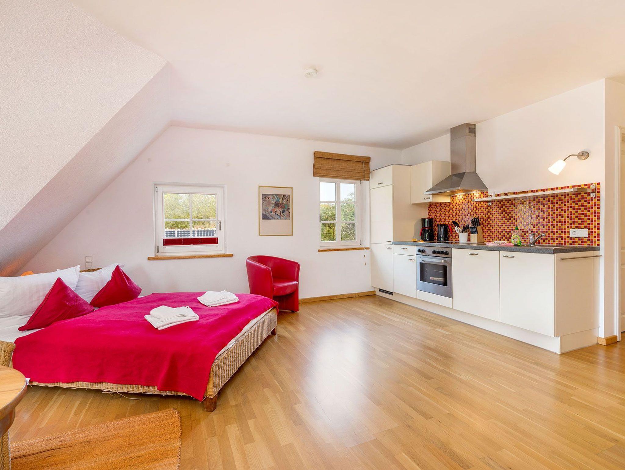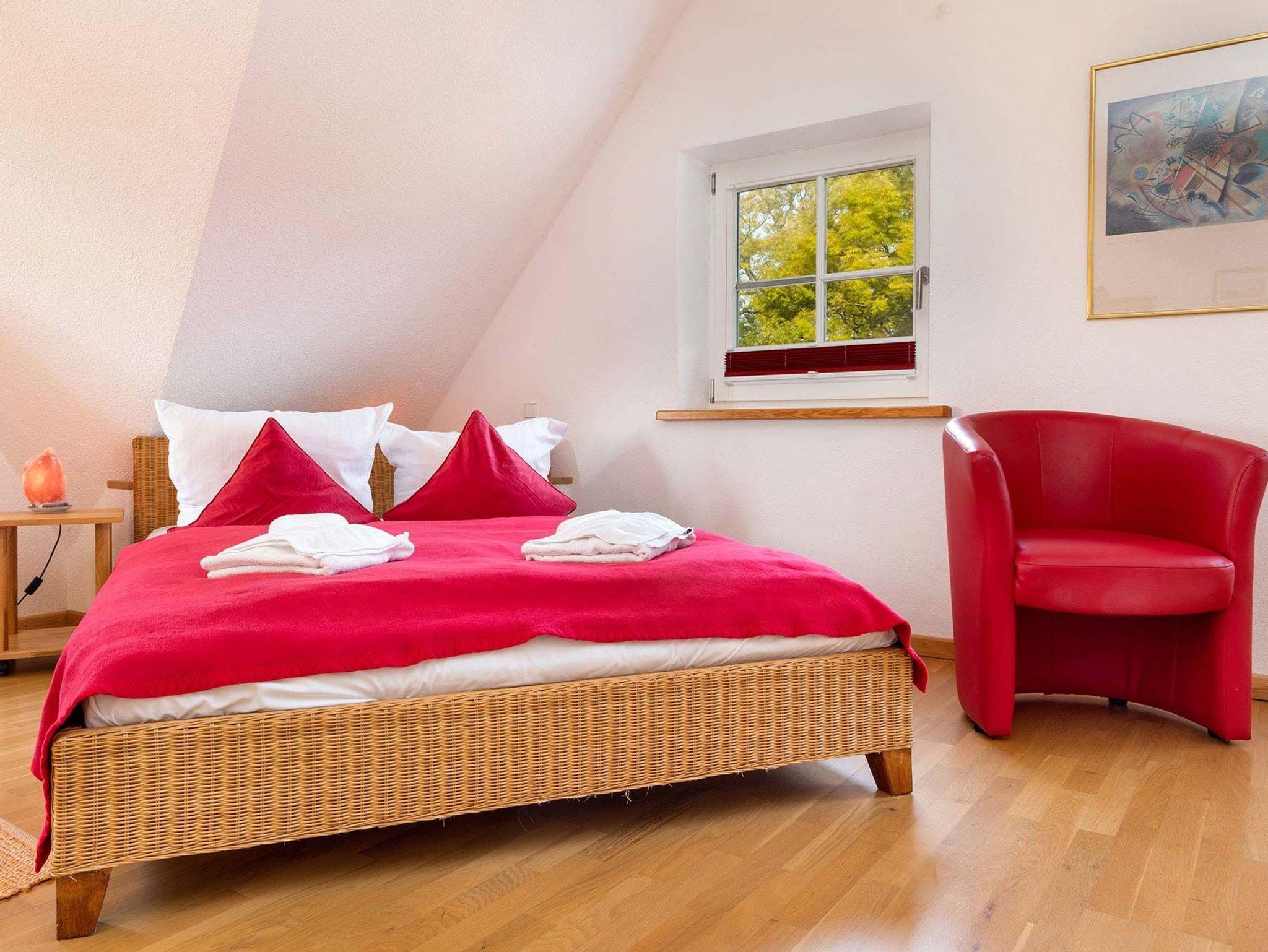 ?Die kleine Rote? ist die ideale Ferienwohnung für ruhesuchende Alleinreisende, aber auch für frisch Verliebte und Paare, die inmitten herrlicher Natur Harmonie und Zweisamkeit genießen möchten. Romantische Dachschrägen, angenehme Naturtöne und das traumhafte Gaubenfenster lassen Ihr Urlaubsdomizil in einladendem Licht erstrahlen. Und damit Sie sich hier auch außerhalb der sommerlichen Badesaison so richtig wohlfühlen können, haben Ihre freundlichen Gastgeber an alles gedacht: Auf den rund 40 liebevoll eingerichteten Quadratmetern Wohnfläche erwarten Sie neben einem kuschligen Doppelbett (140x200cm), einer komplett ausgestattete Küchenzeile und einem schönen Wannenbad auch ein moderner Flachbild-TV, Radio/CD-Player und kostenfreies W-LAN.