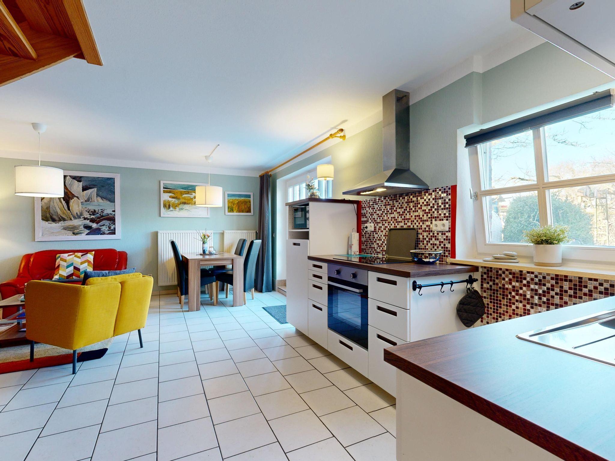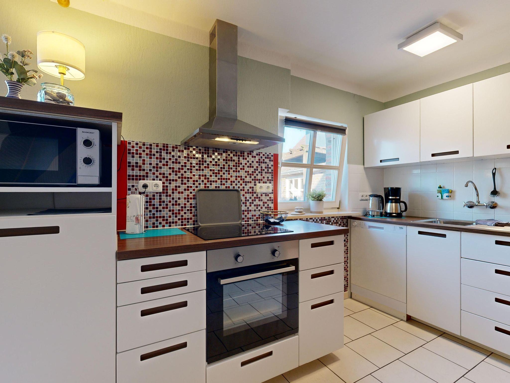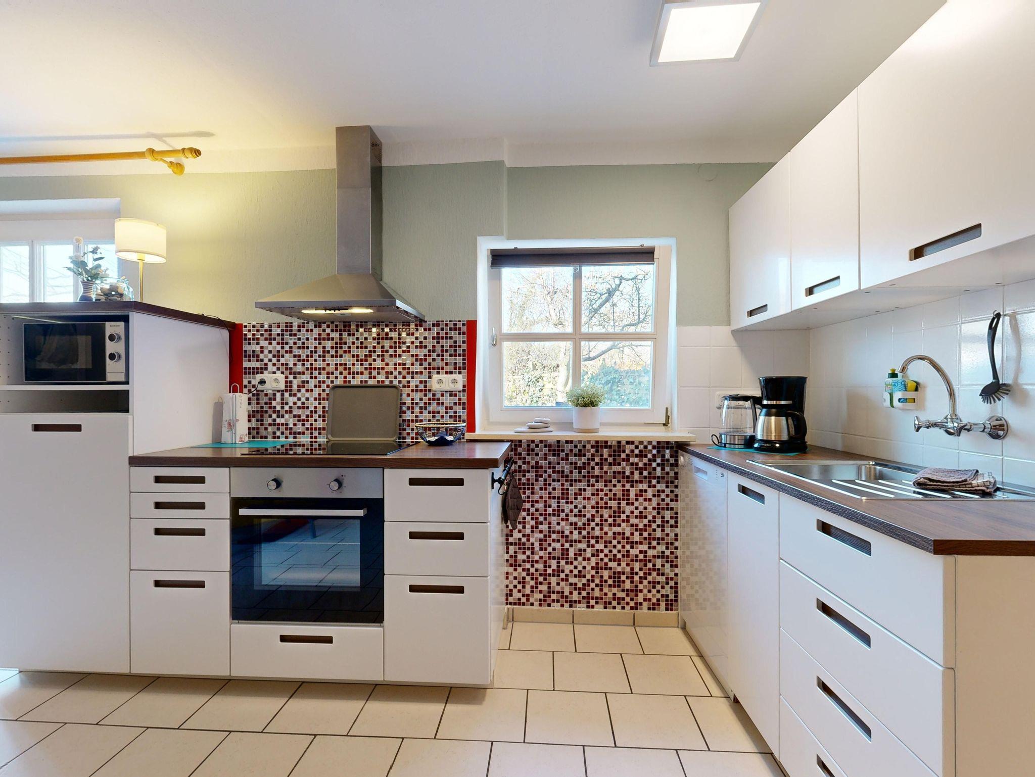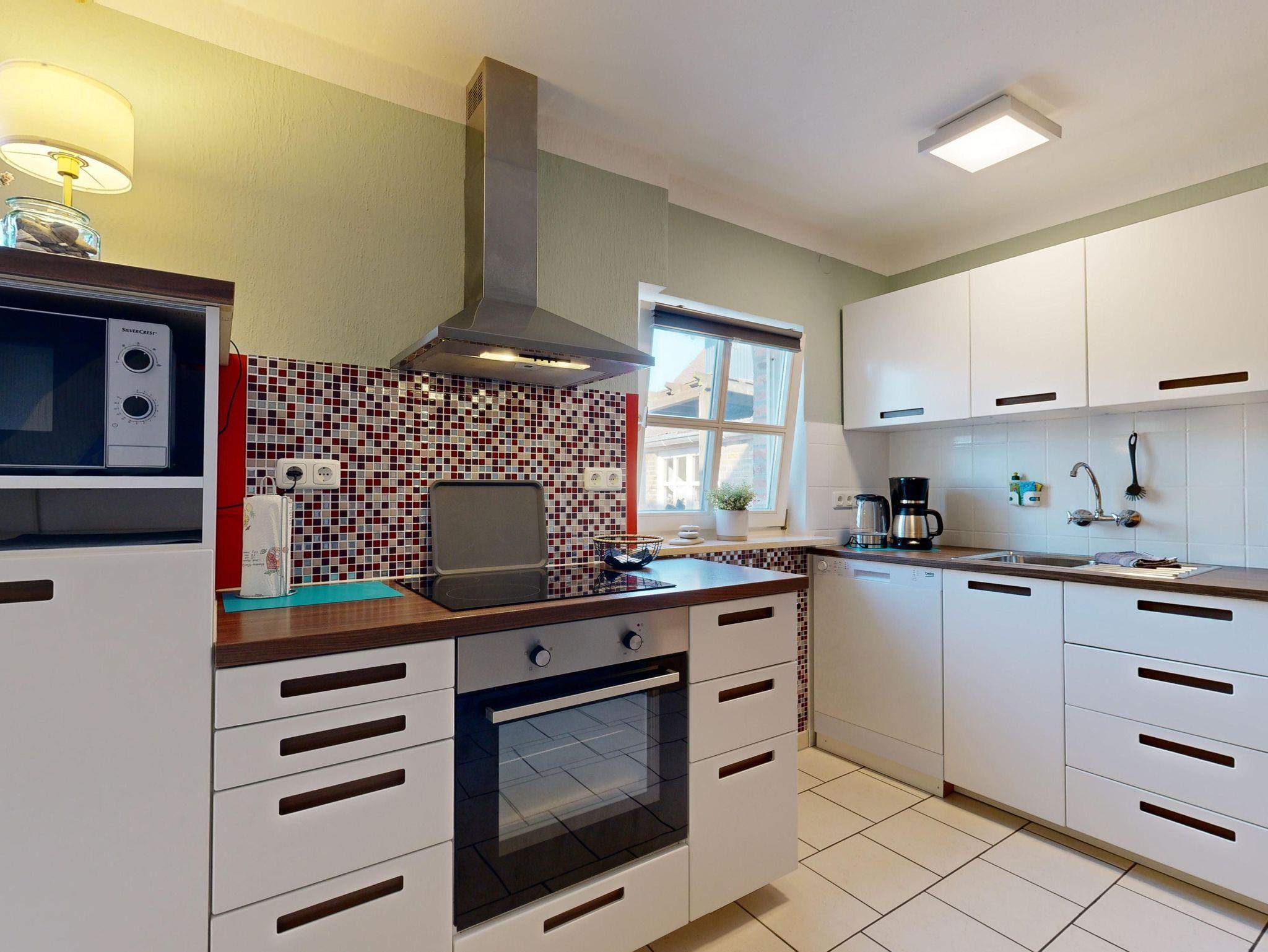 * moderne Küchenzeile: Spülmaschine, Ceran-Herd mit Backofen, Wasserkocher, Kaffeemaschine, Toaster, Essplatz