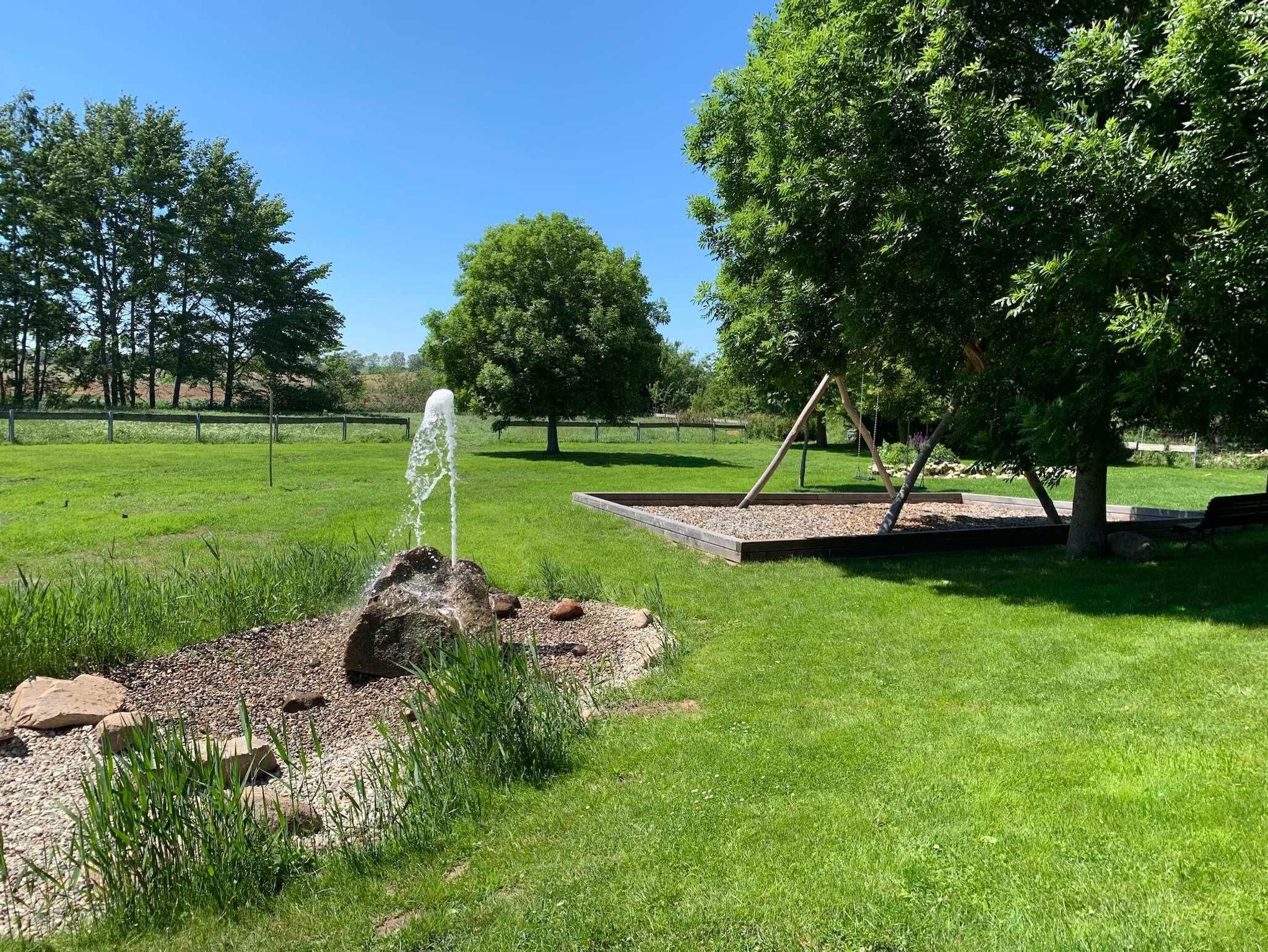Die große Gartenanlage fügt sich harmonisch in die Landschaft ein und bietet viel Platz zum Erholen, Entspannen und Spielen. Im Garten befinden sich Terrassen mit Sitzgruppen, Strandkörbe, eine Liegewiese, Liegestühle und Sonnenschirme. Außerdem gibt es einen Grillplatz und einen Kinderspielplatz.