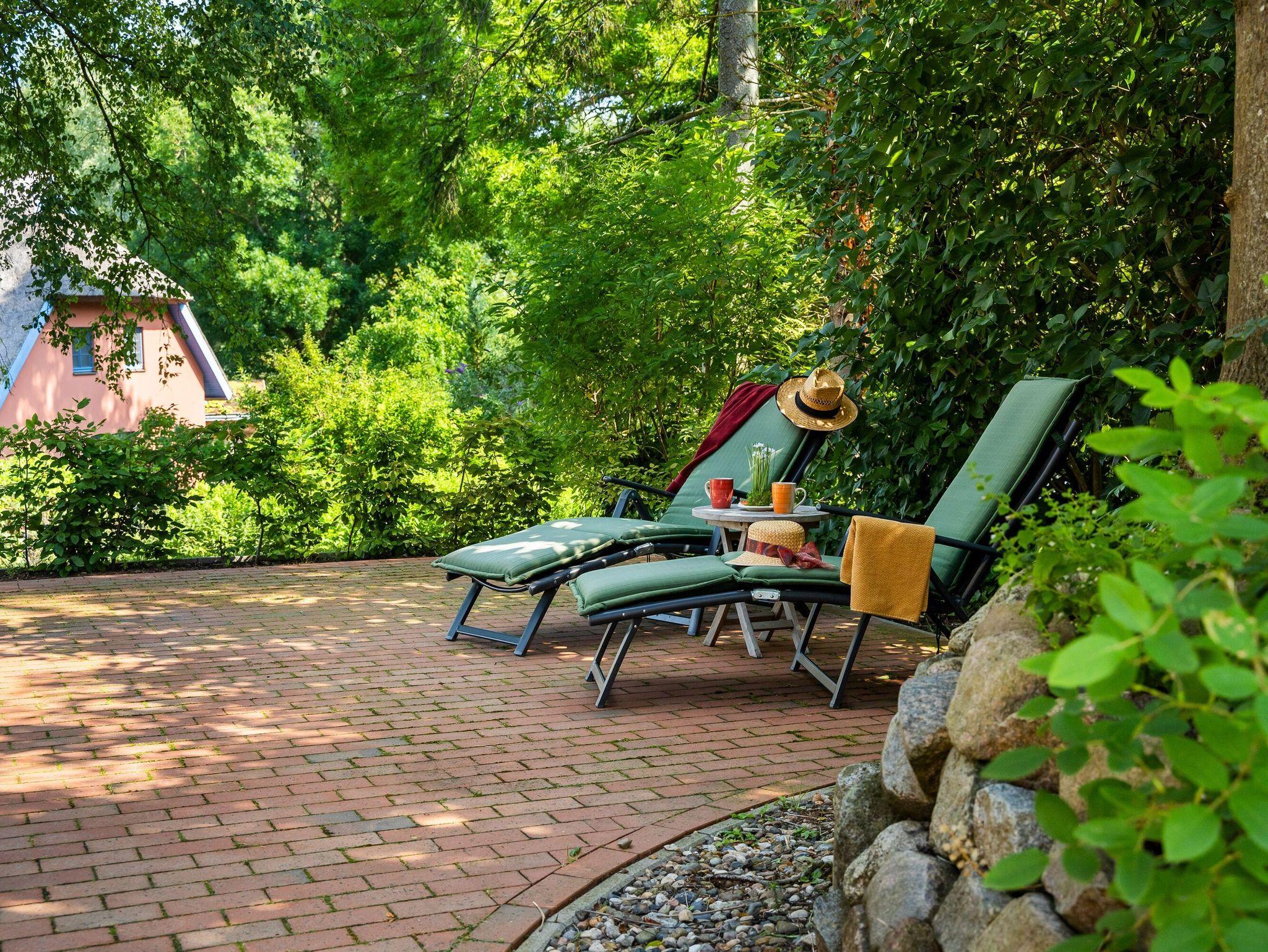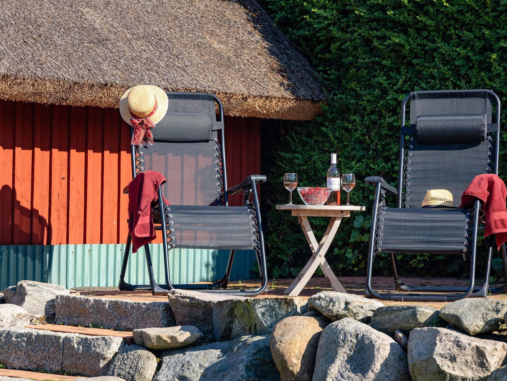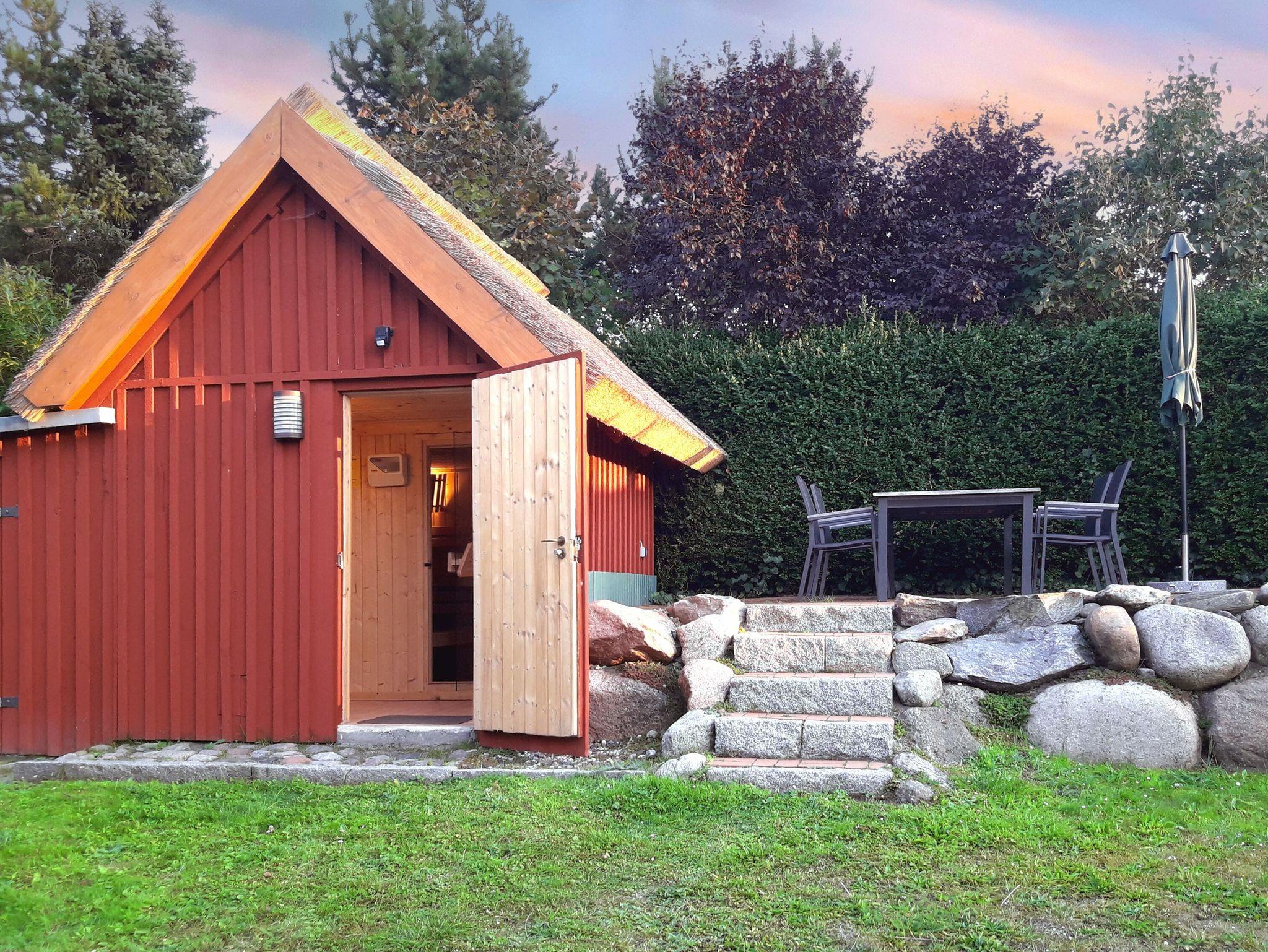 Auf dem gepflegten Gartengrundstück gibt es ein kostenfrei nutzbares Saunahäuschen und eine weitere, etwas erhöht liegende Terrasse. Von hier aus genießen Sie aus der bequemen XXL-Sitzgruppe einen wunderbaren Blick in die umgebende Landschaft und bis hinüber zum Jagdschloss Granitz.
