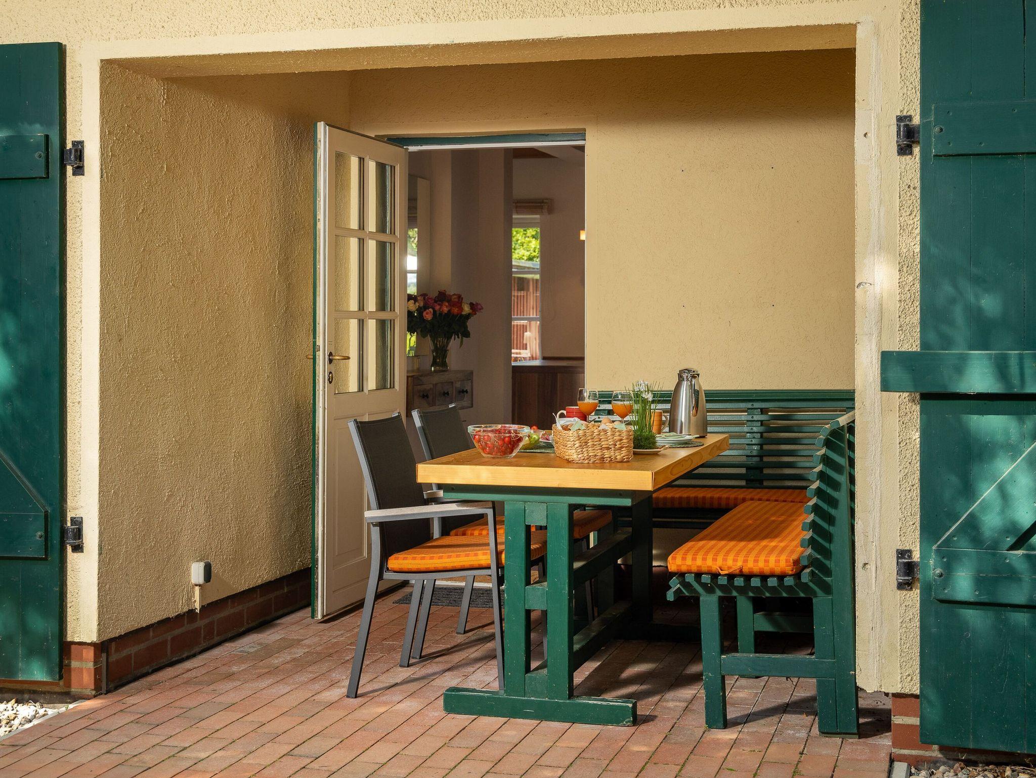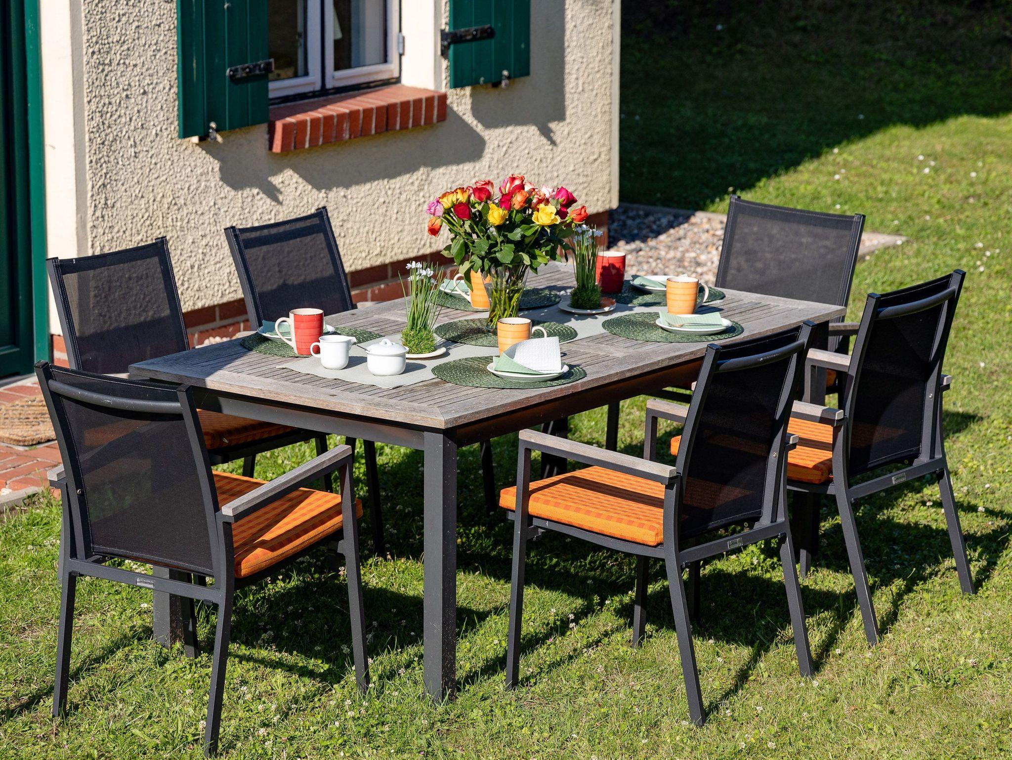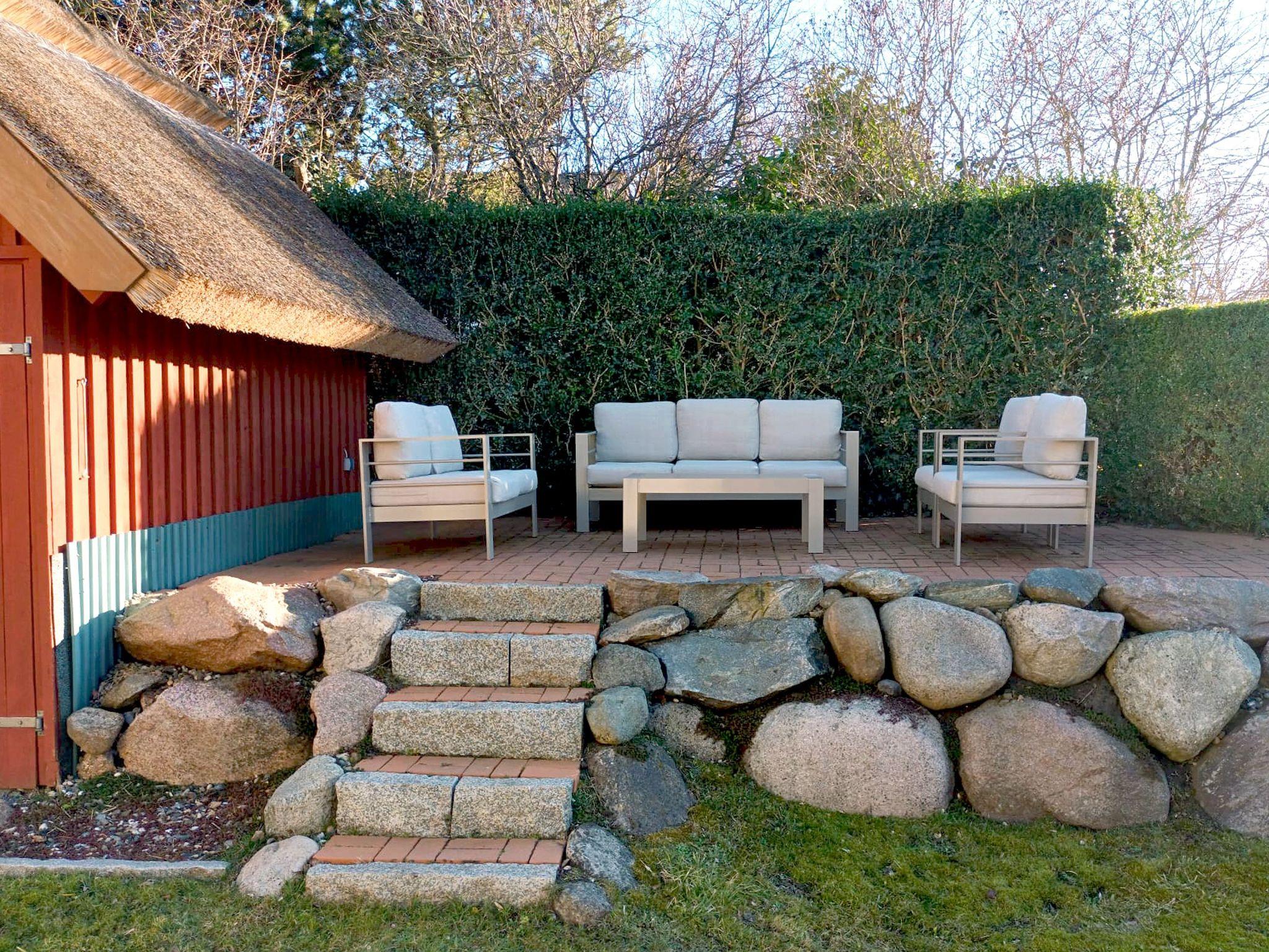 Auf dem gepflegten Gartengrundstück gibt es ein kostenfrei nutzbares Saunahäuschen und eine weitere, etwas erhöht liegende Terrasse. Von hier aus genießen Sie aus der bequemen XXL-Sitzgruppe einen wunderbaren Blick in die umgebende Landschaft und bis hinüber zum Jagdschloss Granitz.