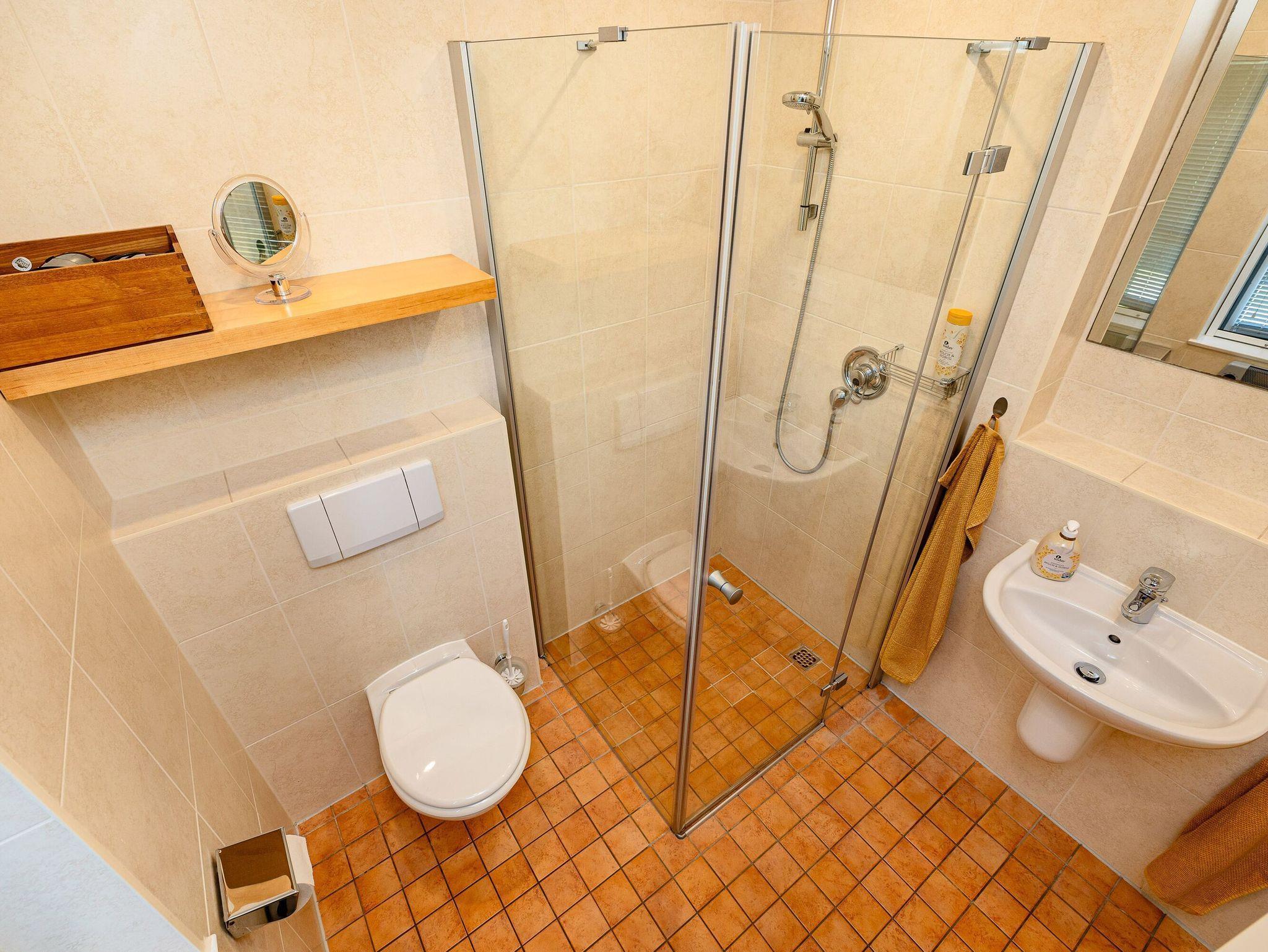 Im Erdgeschoss gibt es außerdem einen Flur mit Garderobe, eine Konsole mit großem Spiegel, ein Duschbad/WC, ein ausziehbares Schlafsofa (1,40 x 2,00m) und einen Hauswirtschaftsraum mit kostenfrei nutzbarer Waschmaschine nebst Bügel- und Reinigungsgeräten.