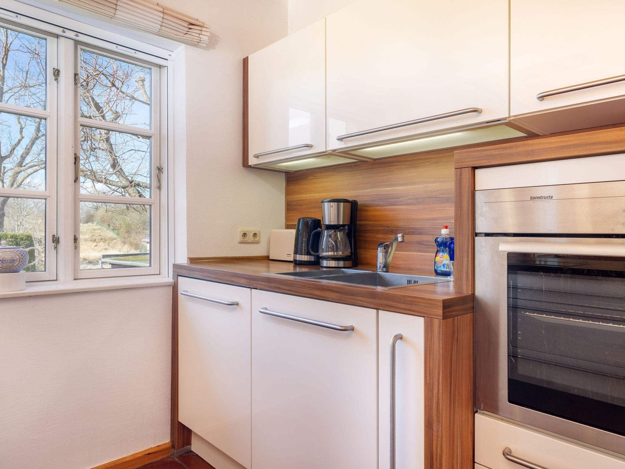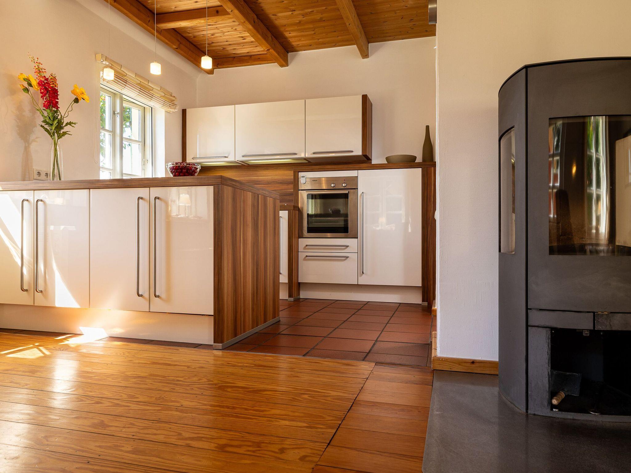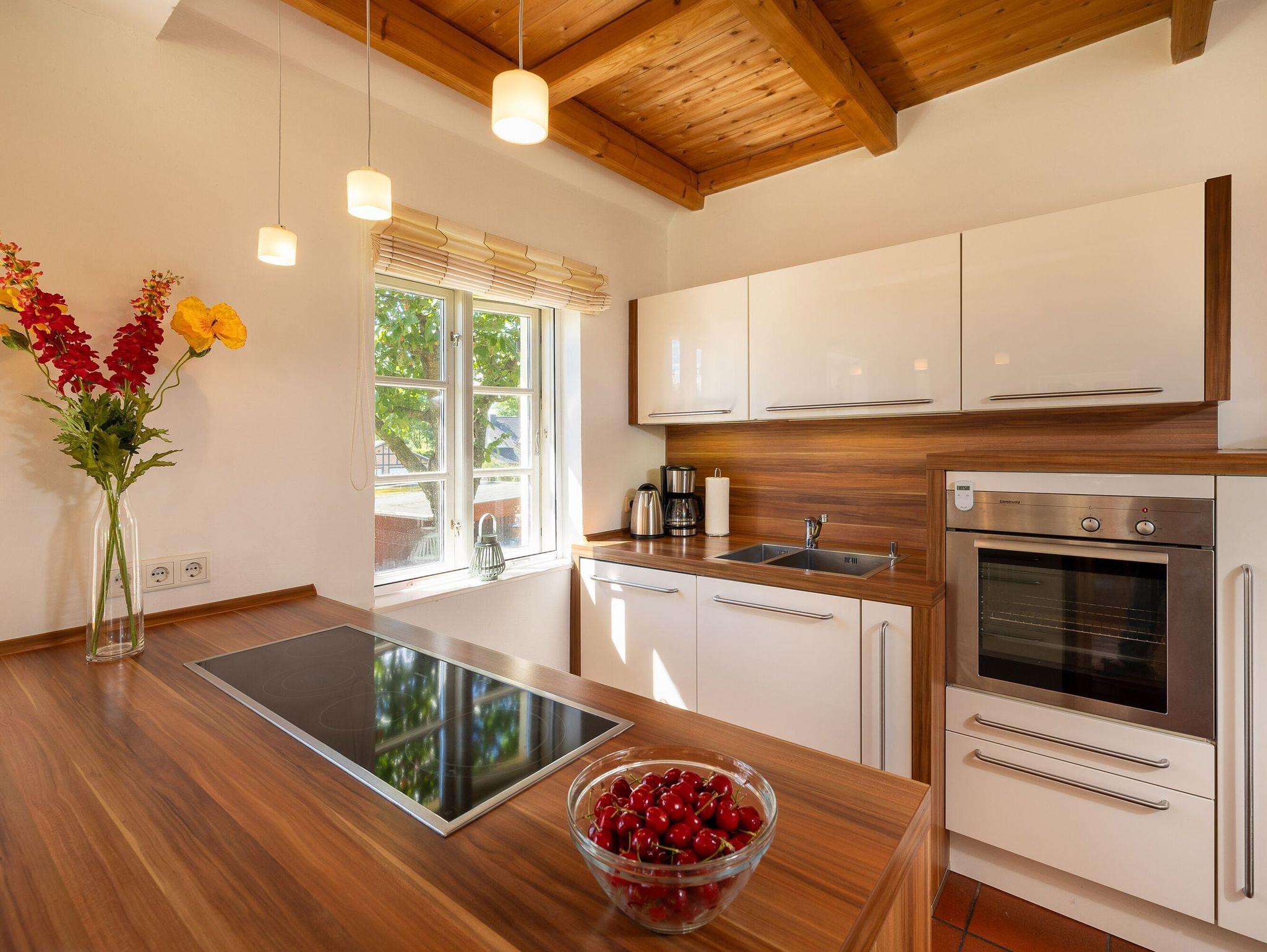 Die offene Küche lässt das Herz aller Hobbyköche höher schlagen. Sie sieht nicht nur chic aus, sondern ist mit Ceranherd, Mikrowelle, Backofen, Kühlschrank mit Gefrierfach, Geschirrspüler, Kaffeemaschine, Wasserkocher und Toaster sowie allem nötigen Besteck und Geschirr allerbestens ausgestattet. Speisen können Sie wahlweise am großen Esstisch im Wohnzimmer oder bei passendem Wetter auch auf der überdachten Frühstücksterrasse, wo Sie die Morgensonne zu Gast haben.