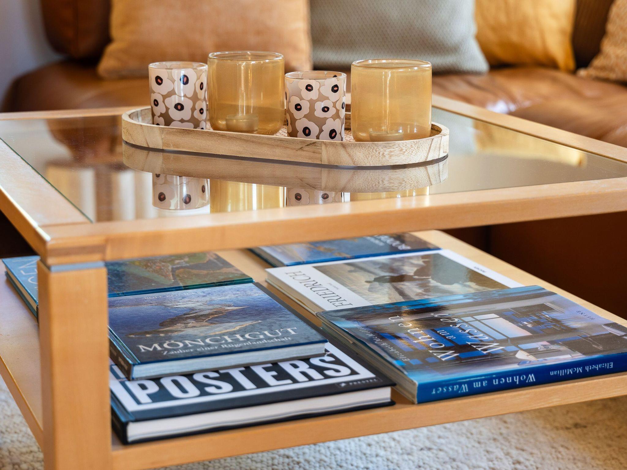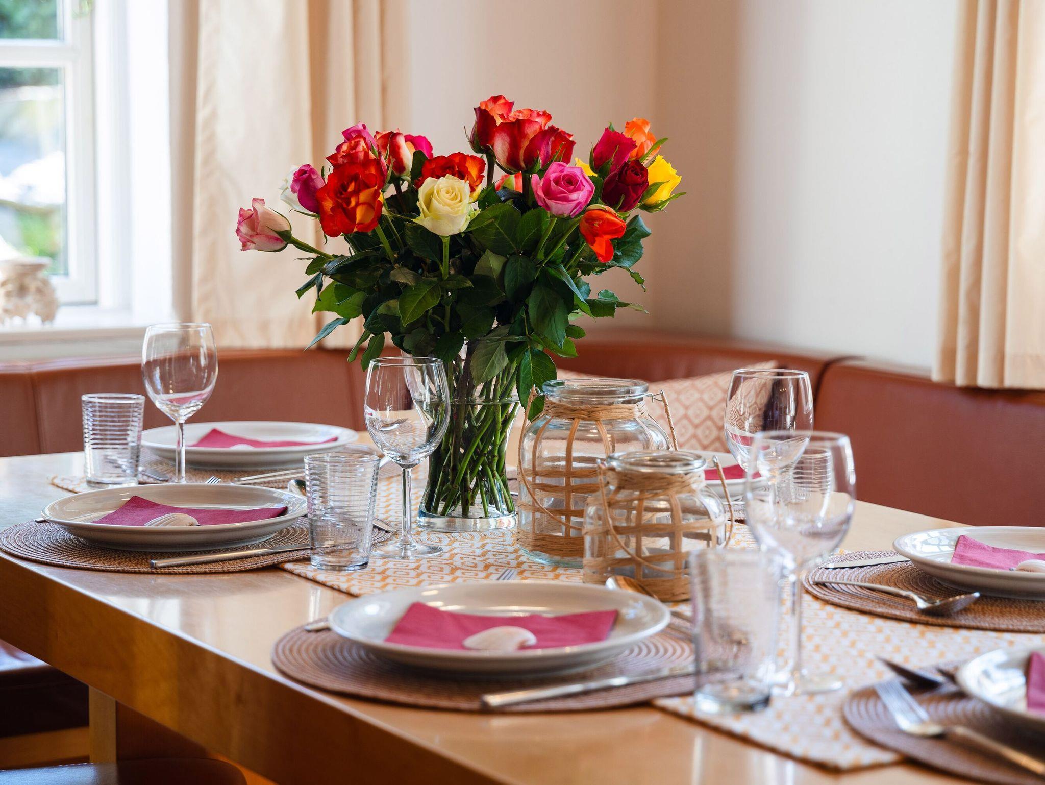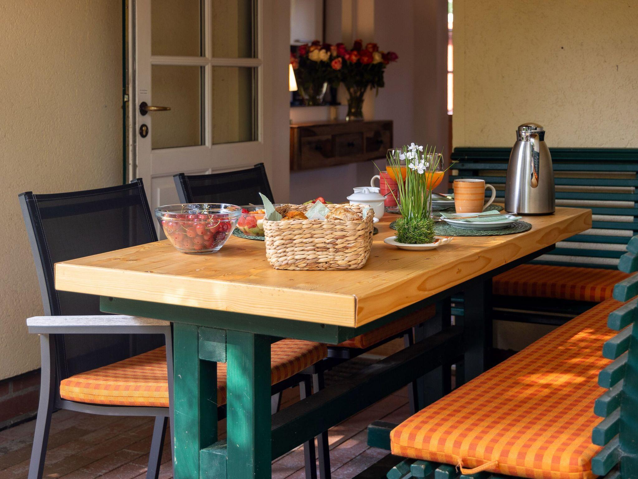 Die offene Küche lässt das Herz aller Hobbyköche höher schlagen. Sie sieht nicht nur chic aus, sondern ist mit Ceranherd, Mikrowelle, Backofen, Kühlschrank mit Gefrierfach, Geschirrspüler, Kaffeemaschine, Wasserkocher und Toaster sowie allem nötigen Besteck und Geschirr allerbestens ausgestattet. Speisen können Sie wahlweise am großen Esstisch im Wohnzimmer oder bei passendem Wetter auch auf der überdachten Frühstücksterrasse, wo Sie die Morgensonne zu Gast haben.