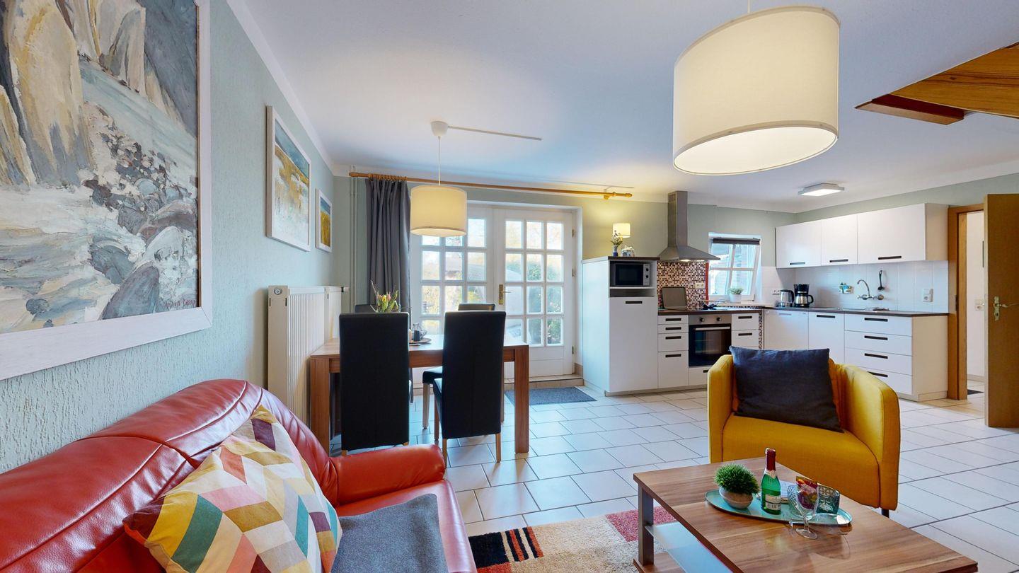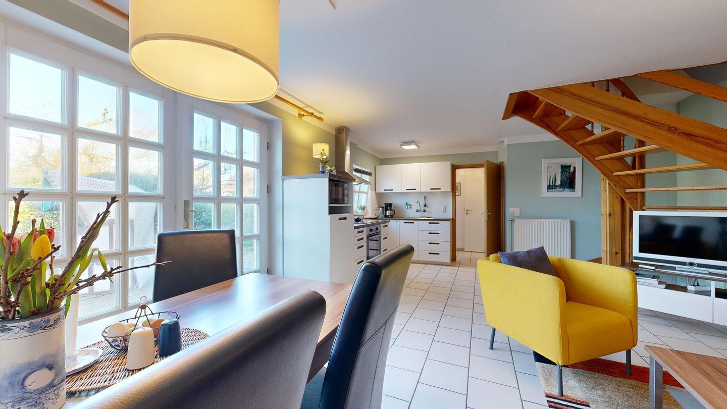Urlaub für alle, die Platz und Ruhe schätzen! Diese liebevoll eingerichtete Doppelhaushälfte besticht durch einen offenen Wohnbereich und eine voll ausgestattete Küchenzeile. Zwei Schlafzimmer bieten Raum für bis zu fünf Personen – ideal für Familien oder Freundesgruppen. Auf der sonnigen Terrasse mit Strandkorb schmeckt der Morgenkaffee besonders gut, während der private Garten mit Schaukel, Trampolin und Spielfläche Kinderherzen höherschlagen lässt. Ein ruhiger Rückzugsort.