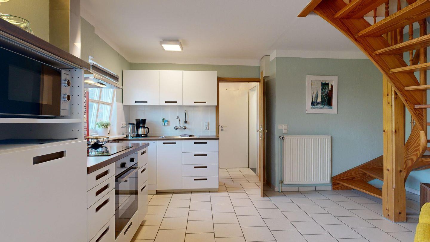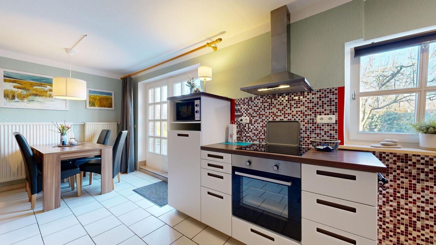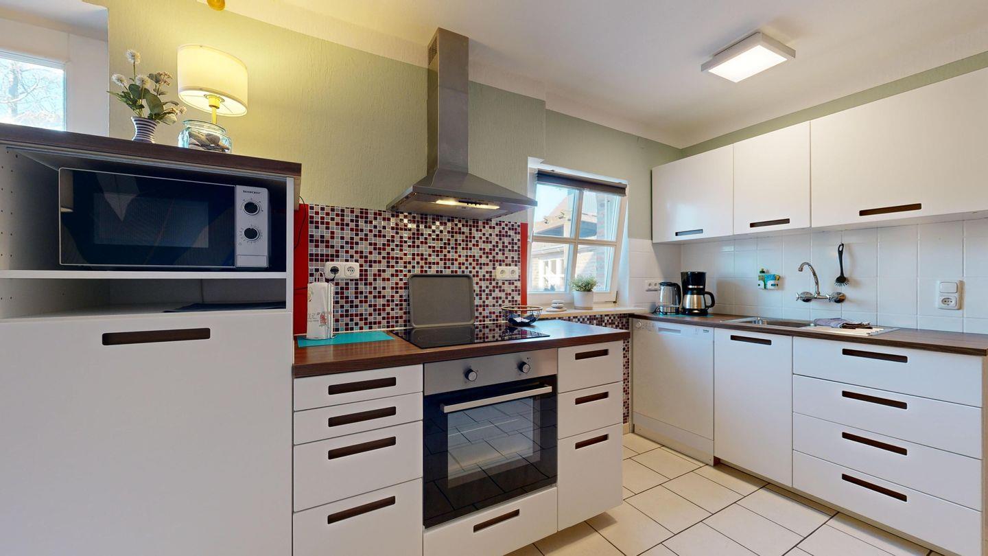 * moderne Küchenzeile: Spülmaschine, Ceranherd mit Backofen, Wasserkocher, Kaffeemaschine, Toaster, Essplatz