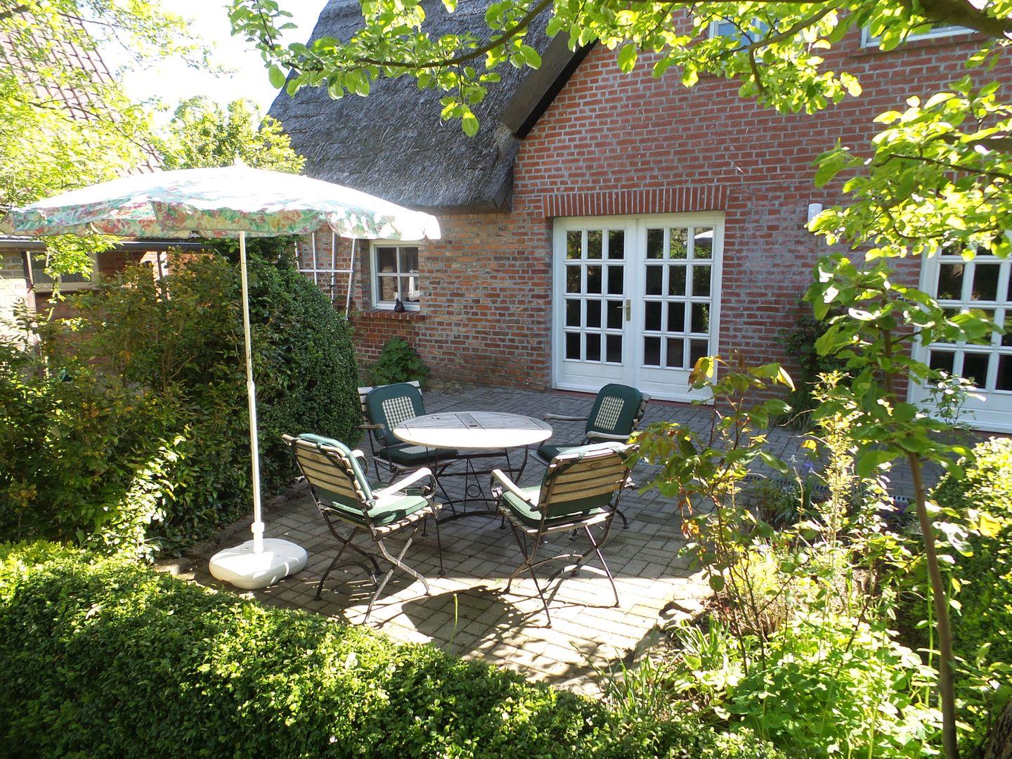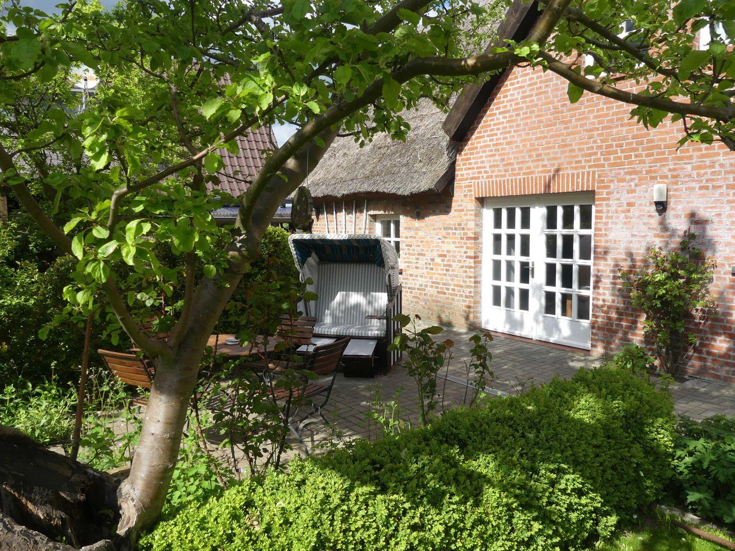 * Terrasse zum Westen (bekommt aber auch Südsonne) mit Gartenmöbeln und Strandkorb
