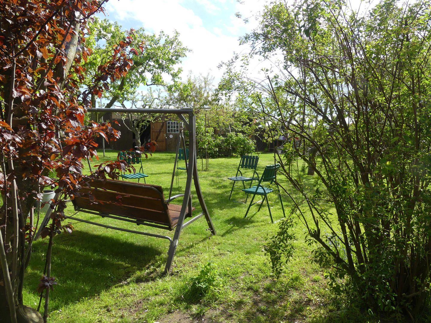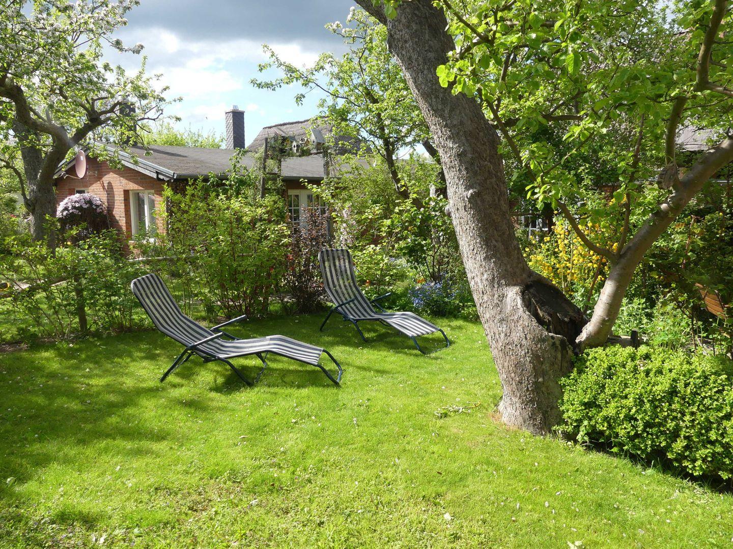 * großer Garten mit hübschen Blumenrabatten, altem Obstbaumbestand und Sonnenliegen
