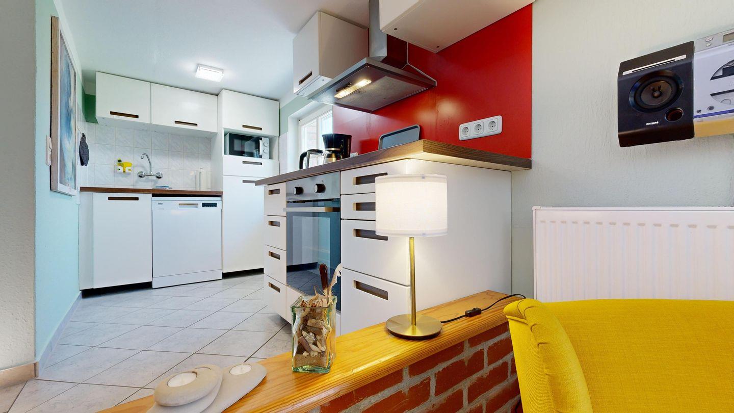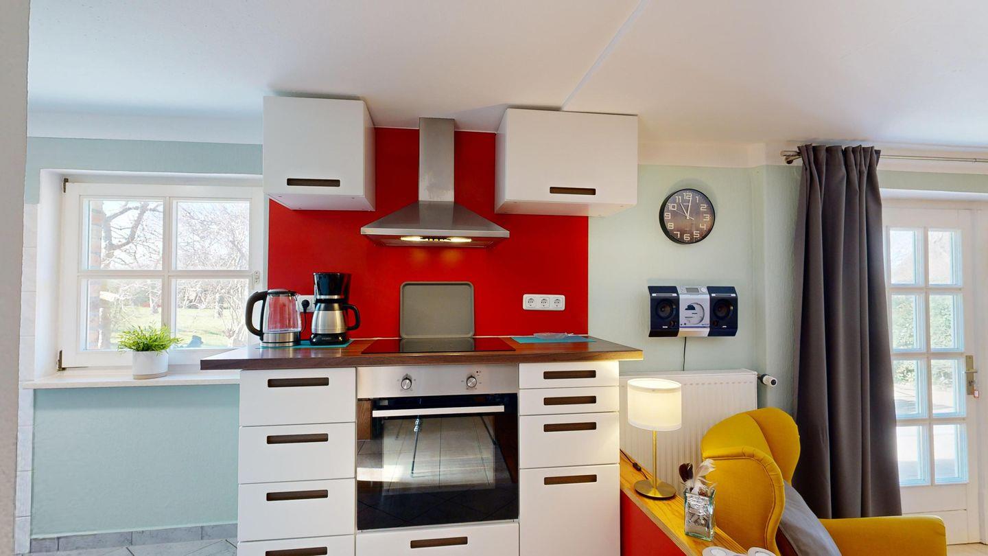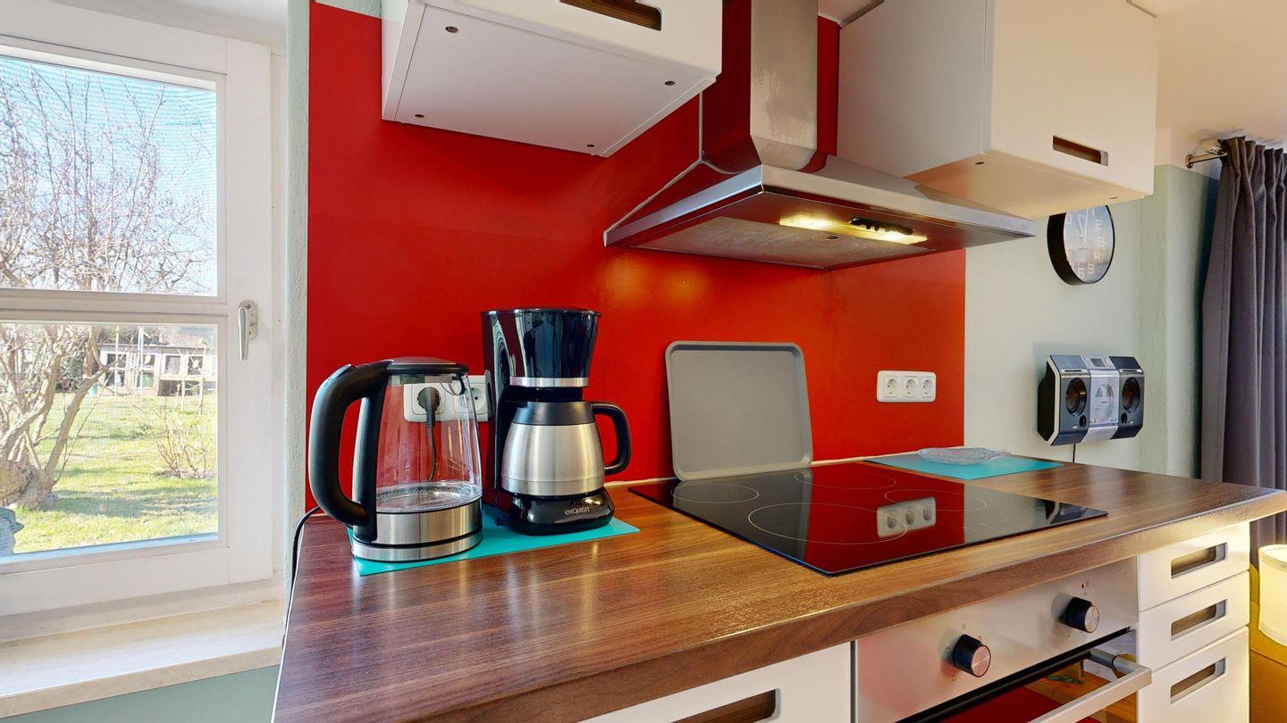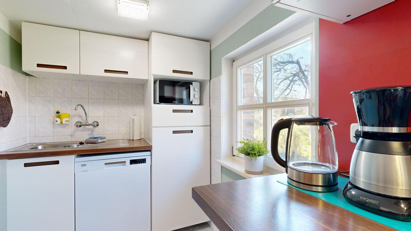 * moderne Küchenzeile: Spülmaschine, Ceranherd mit Backofen, Mikrowelle, Wasserkocher, Toaster, Kaffeemaschine, Essplatz