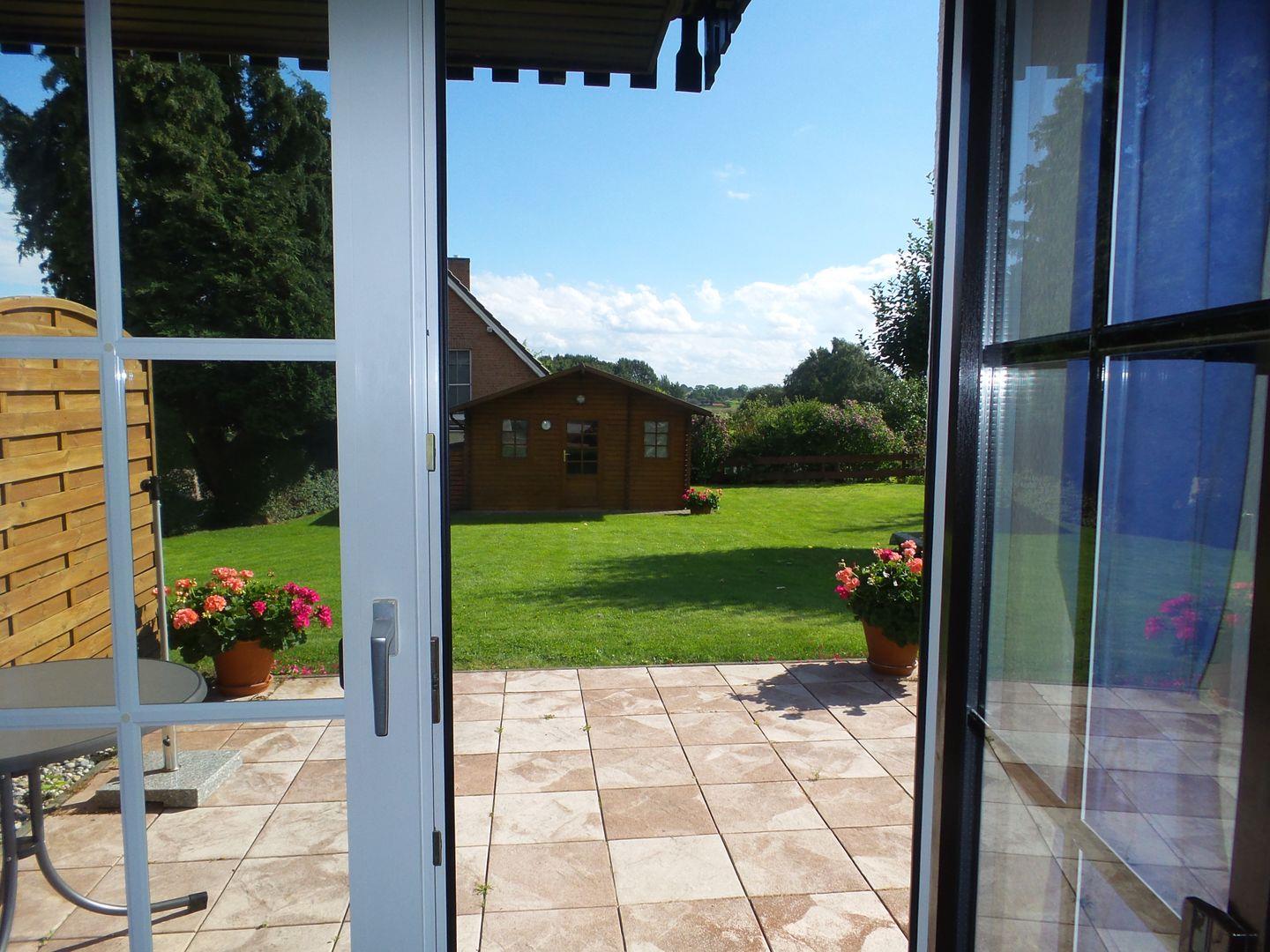 Idyllisches Reetdachhaus mit Terrasse und großem Garten in ruhiger Lage für erholsame Ferien.