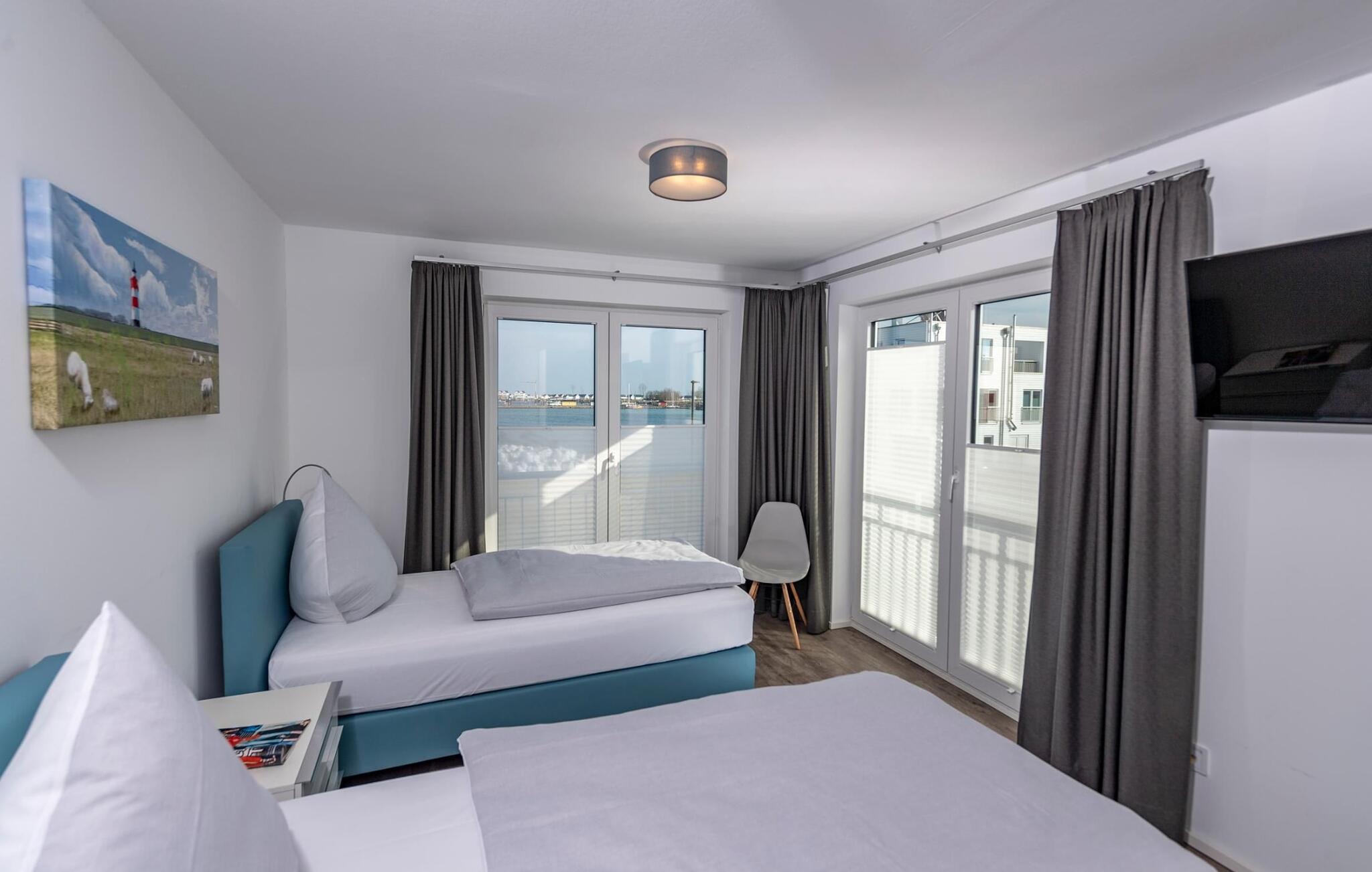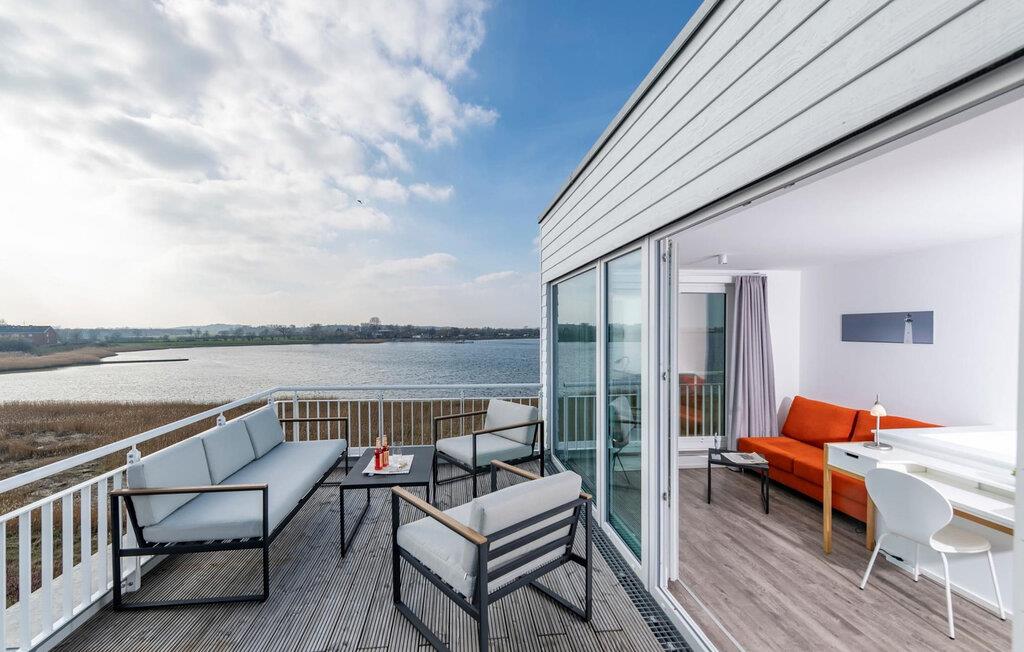 Highlight stellt das Studio mit angrenzender großer Dachterrasse und 360° Wasserblick dar. Ob Hafenkino oder Flugshow von Wildgänsen, Enten und Schwänen… für naturnahe Unterhaltung ist hier gesorgt.