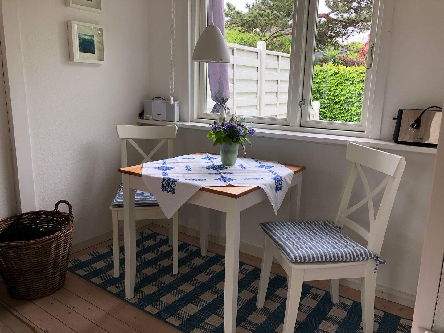 Der einladende Wohnbereich ist hell und optimal eingerichtet mit einer Couch, Schwingsessel und Kamin, kann man hier entspannte Stunden verbringen. Der Holzofen sorgt für wohlige Wärme und ein Stück Hygge – das Feuerholz liegt direkt am Haus bereit. Der Essbereich bietet Platz für 2 Personen und ist am hellen Fenster mit Blick in den ungestörten Garten perfekt ausgerichtet.