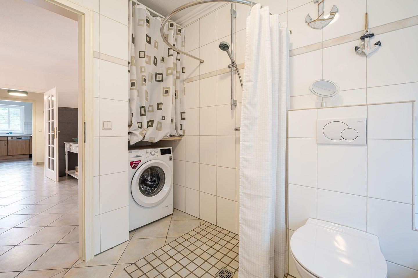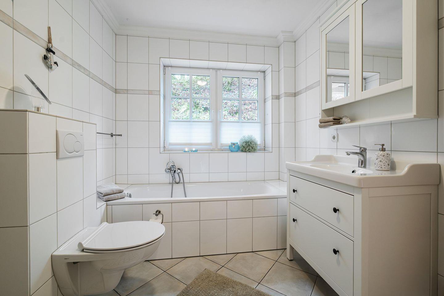 Das moderne Badezimmer mit Badewanne, barrierefreier Dusche und Waschmaschine verfügt über eine Fußbodenheizung und Tageslichtfenster.