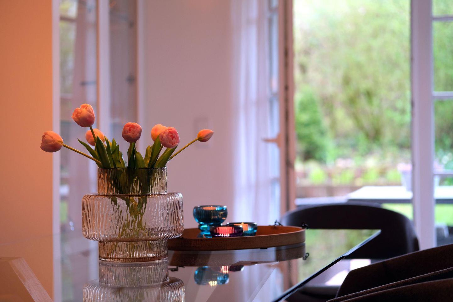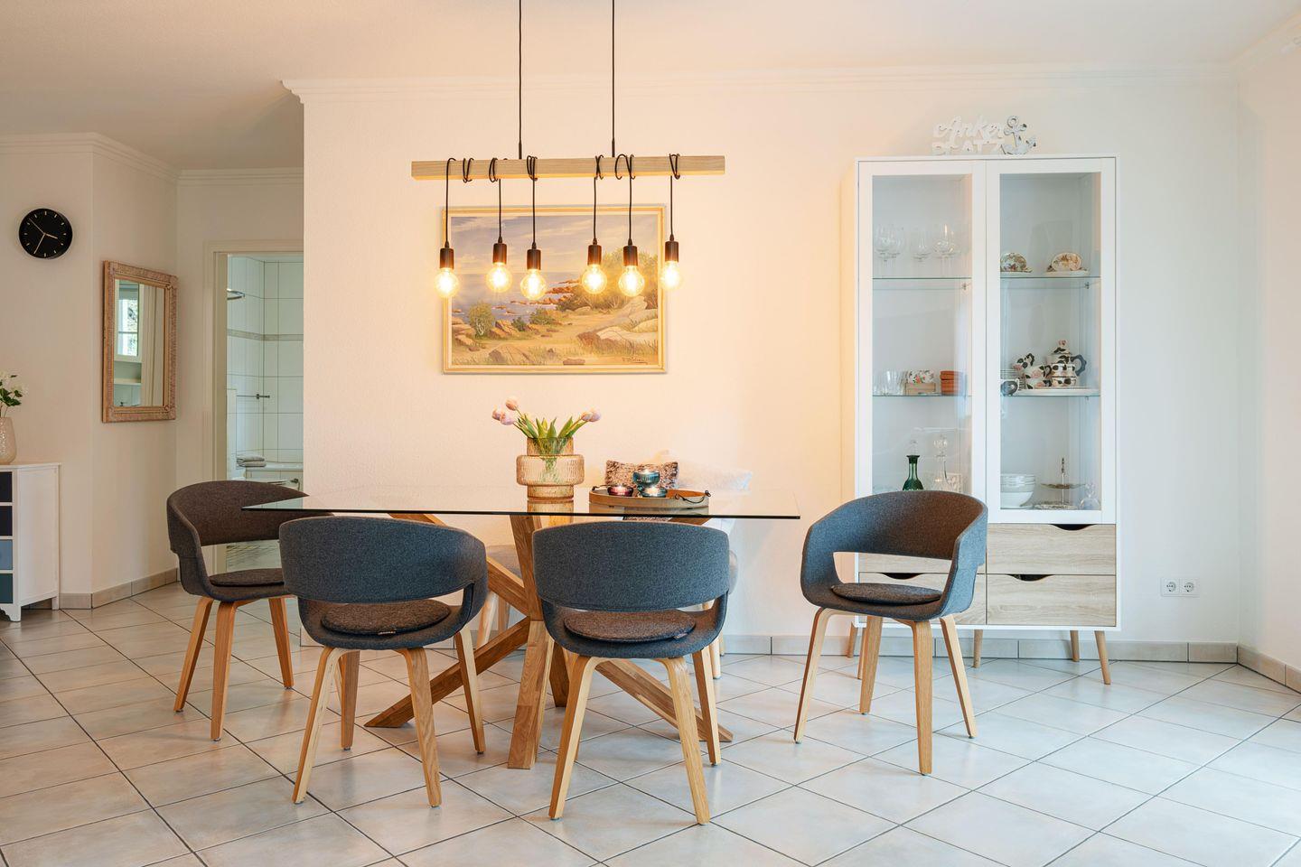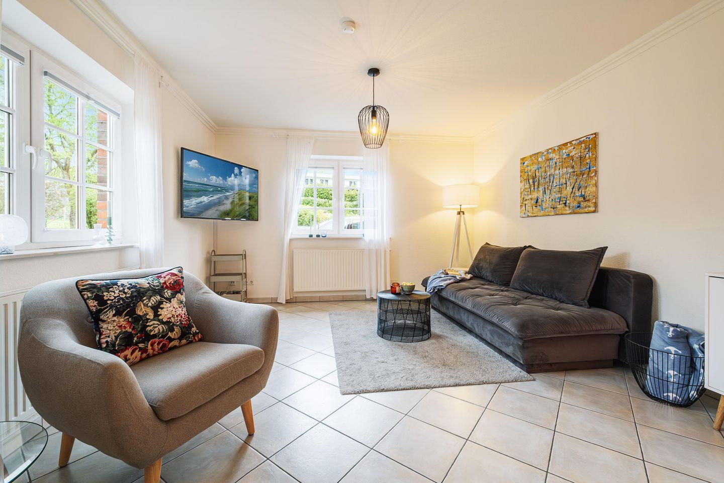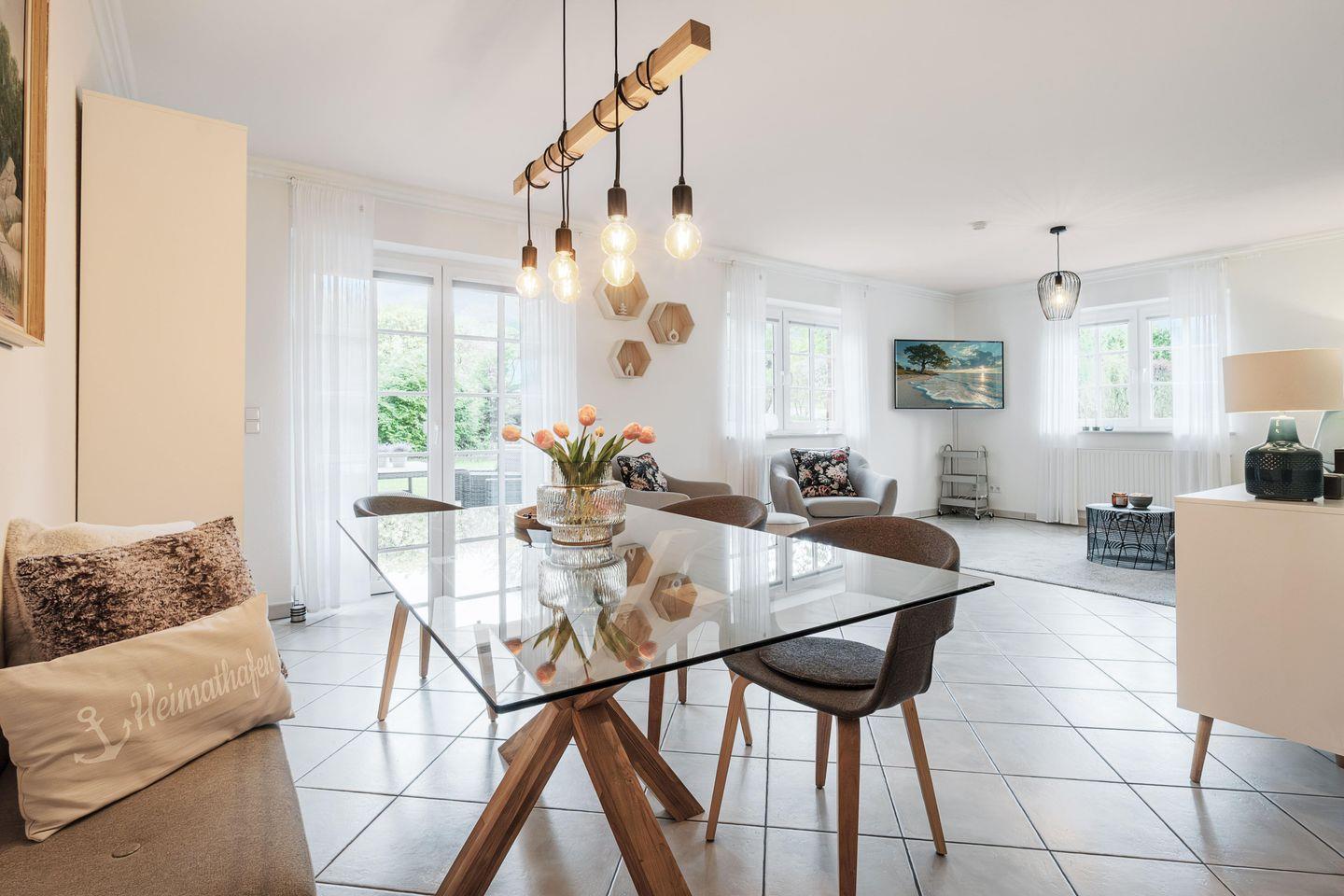 Der großzügige Wohn-/Essbereich mit Schlafcouch (140 x 200 cm), Smart TV und dem großen Esstisch für 4 Personen ist der Mittelpunkt der Wohnung. Hier ist Platz für gemütliche Stunden und gemeinsame Mahlzeiten, die in der voll ausgestatteten Küche zubereitet werden können. Von hier aus geht es auch auf die Sonnenterrasse und in den eigenen Garten.