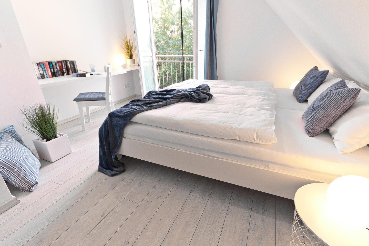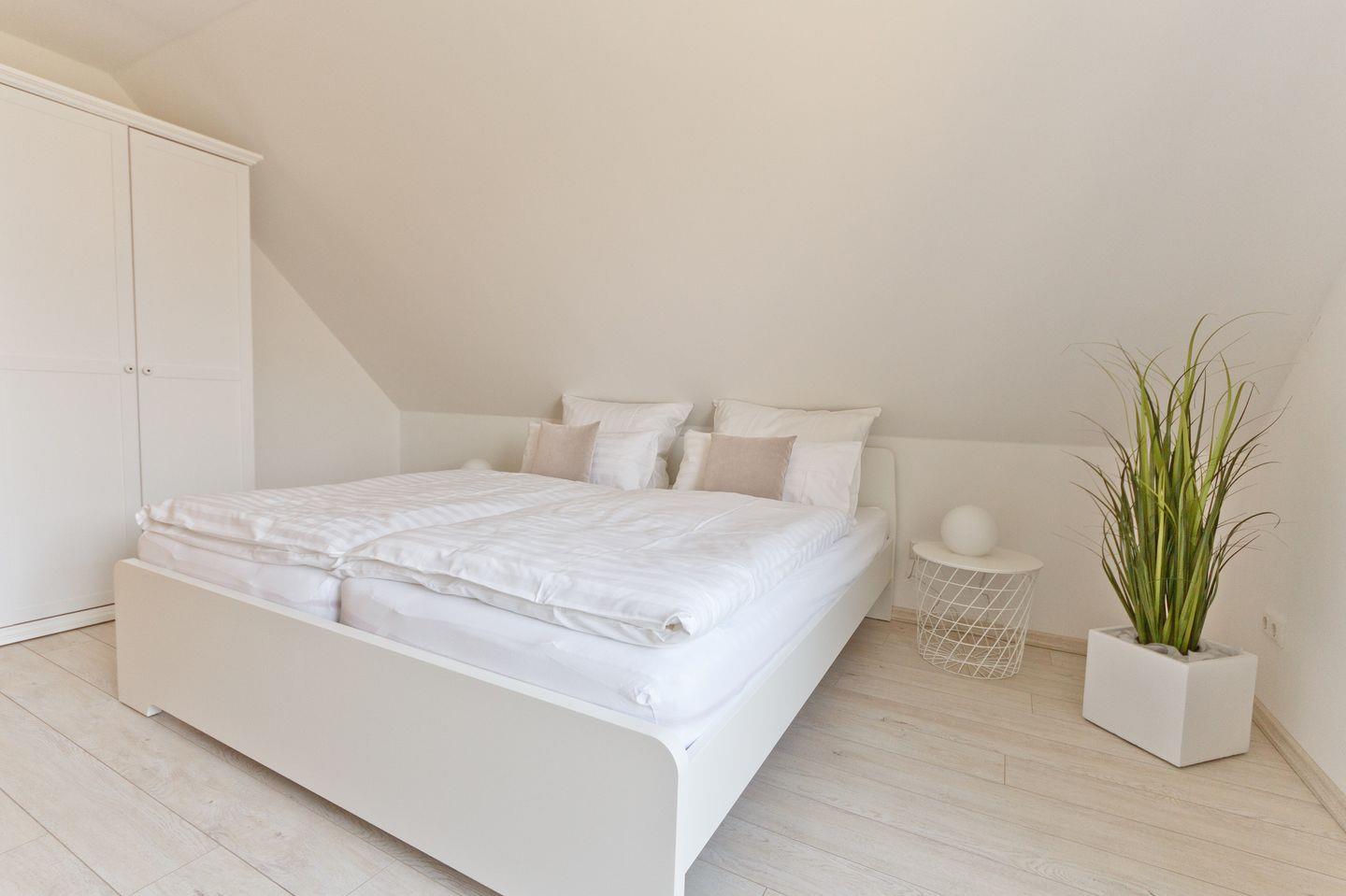 Im Obergeschoss befinden sich auch die Schlafzimmer. Alle drei Schlafzimmer sind jeweils mit einem Doppelbett (180 × 200 cm), einem Kleiderschrank und Verdunkelungsmöglichkeiten ausgestattet. Eines der Schlafzimmer verfügt zusätzlich über einen Smart-TV.