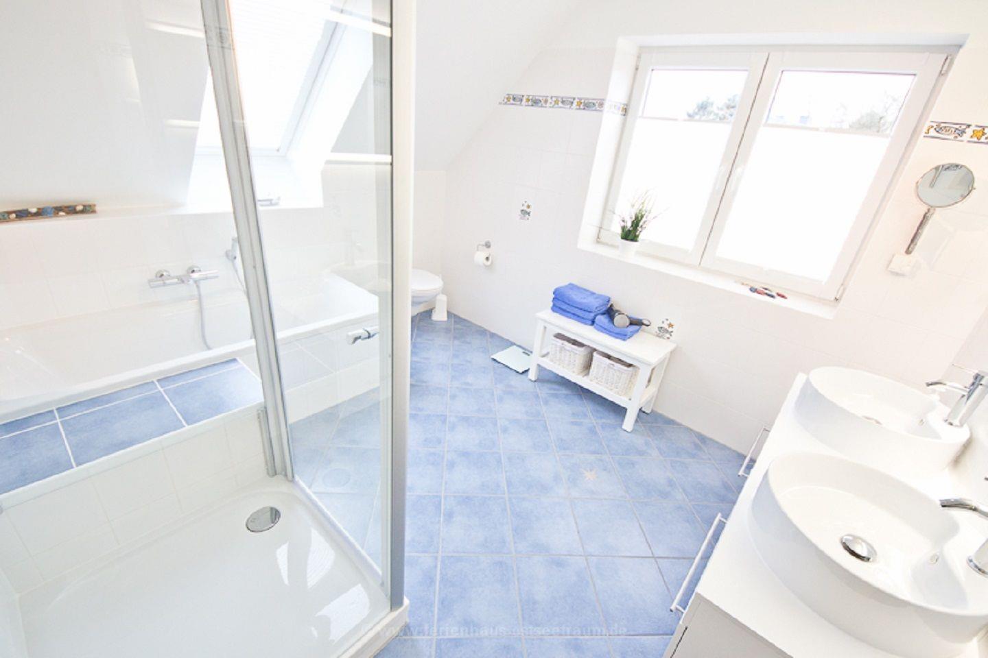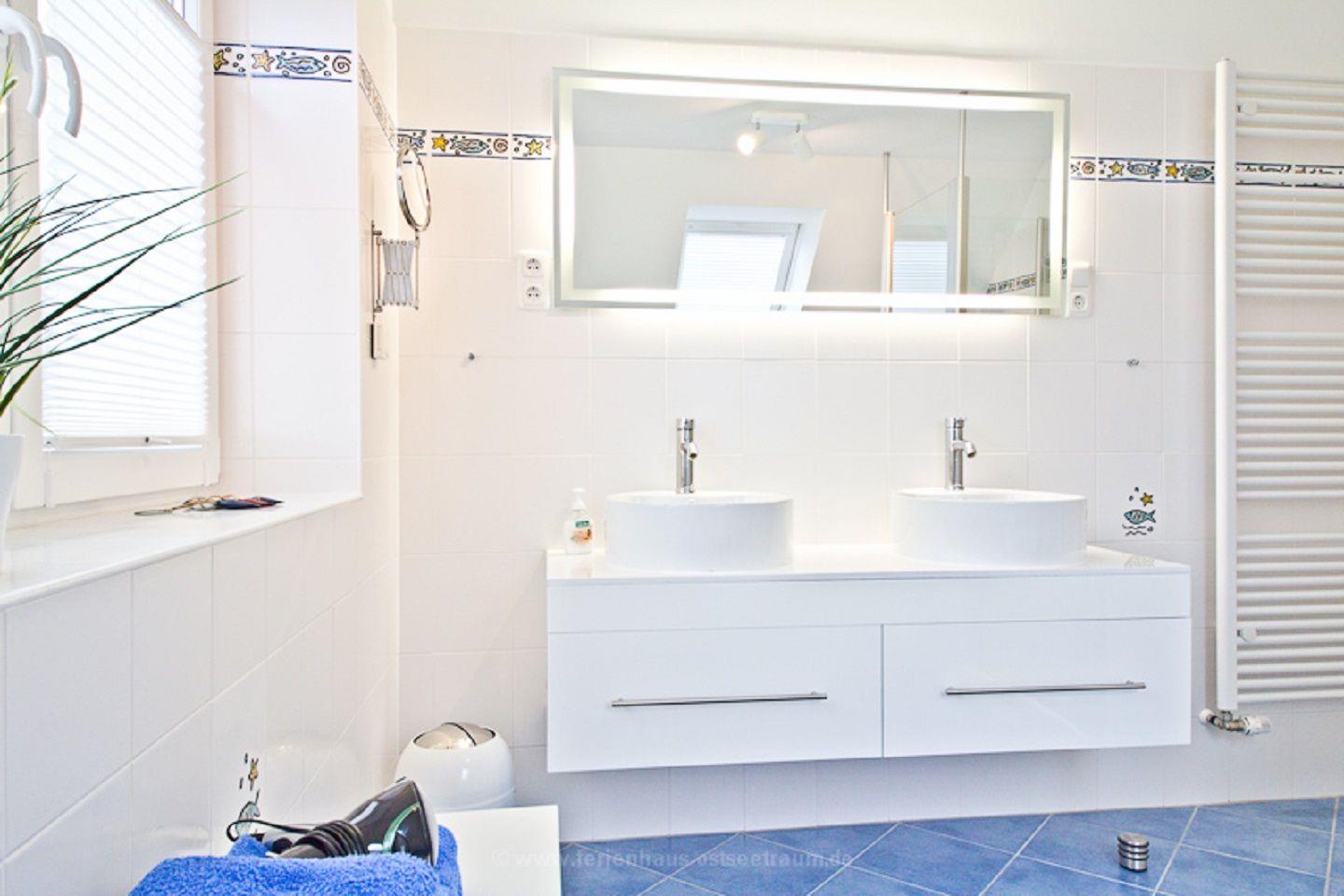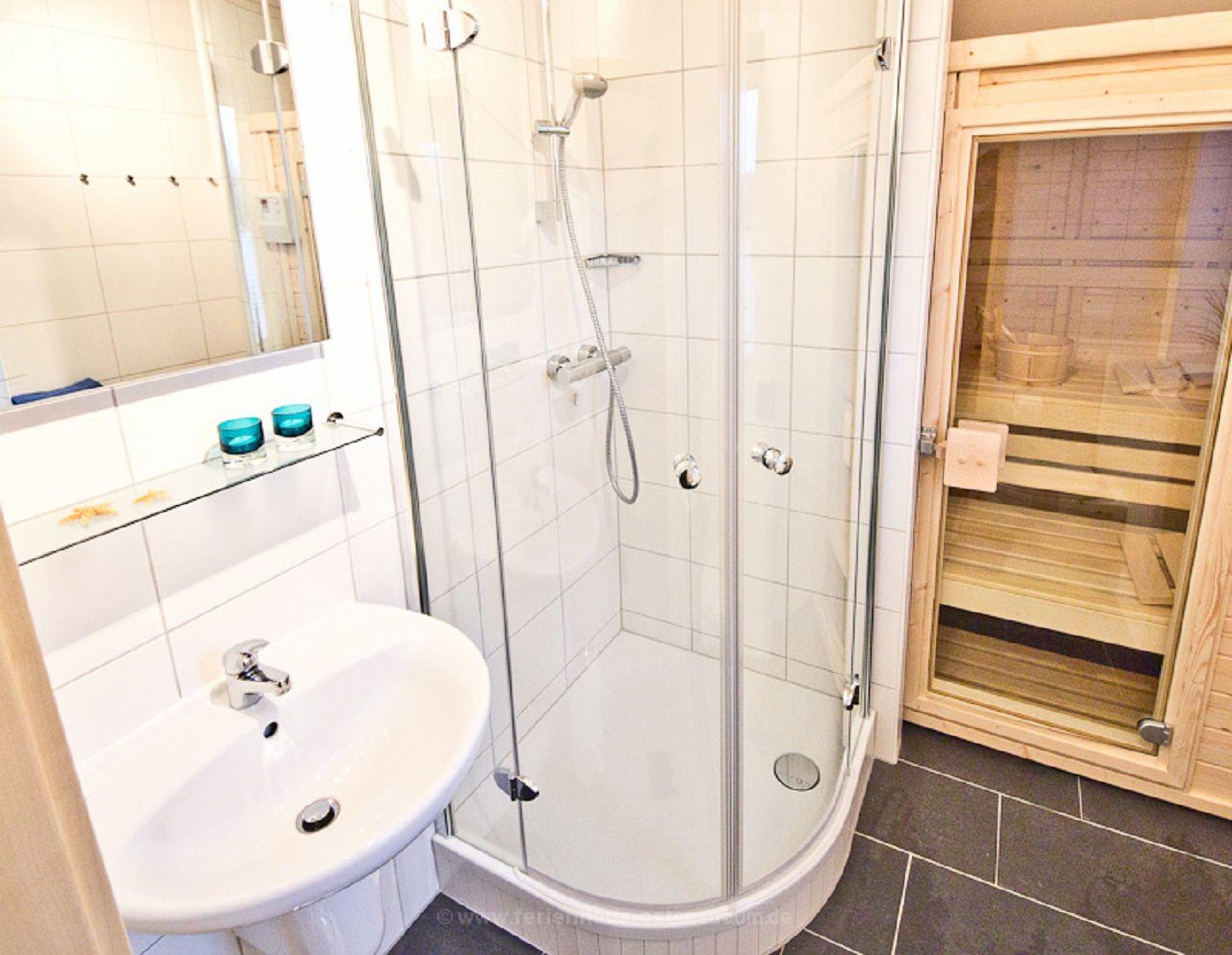 Im Haus stehen Dir zwei Bäder zur Verfügung. Das Duschbad befindet sich im Erdgeschoss und bietet eine finnische Sauna – hier kannst Du ideal entspannen. Im Obergeschoss befindet sich ein Vollbad mit Badewanne, Dusche, Doppelwaschbecken, Handtuchtrockner und einem Fön. Beide Bäder halten für Dich jeweils einen Fön bereit.