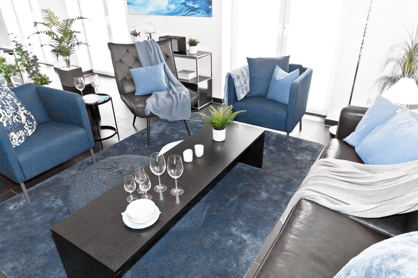 Im Erdgeschoss ist der stilvolle Wohn- und Essbereich mit der offenen Küche ein absoluter Blickfang. Mache es Dir auf dem Sofa, einem der Sessel oder auch auf dem Sitzsack bequem und genieße an kühleren Tagen die wohlige Wärme des Kaminofens. Schaue gemeinsam auf dem Smart-TV einen Film, lies eines der hauseigenen Bücher oder verbringe zusammen einen geselligen Spieleabend am Esstisch.